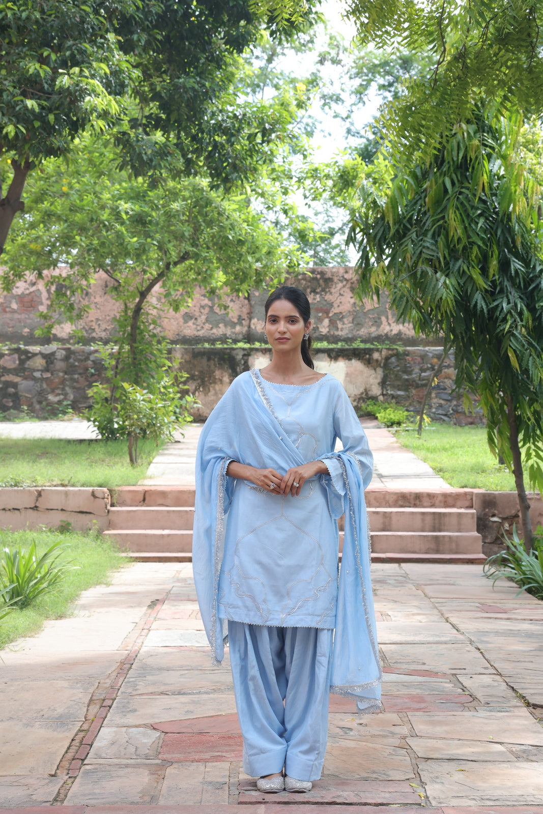The Fiza set embodies soft romance in powder baby blue pure mul chanderi. This elegant ensemble features all-over hand and machine embroidery that adorns the entire kurta, creating a delicate textured surface that catches light beautifully. The boat neckline is finished with intricate scalloped embroidered edging, while three-quarter sleeves with matching embroidered cuffs complete the refined silhouette.