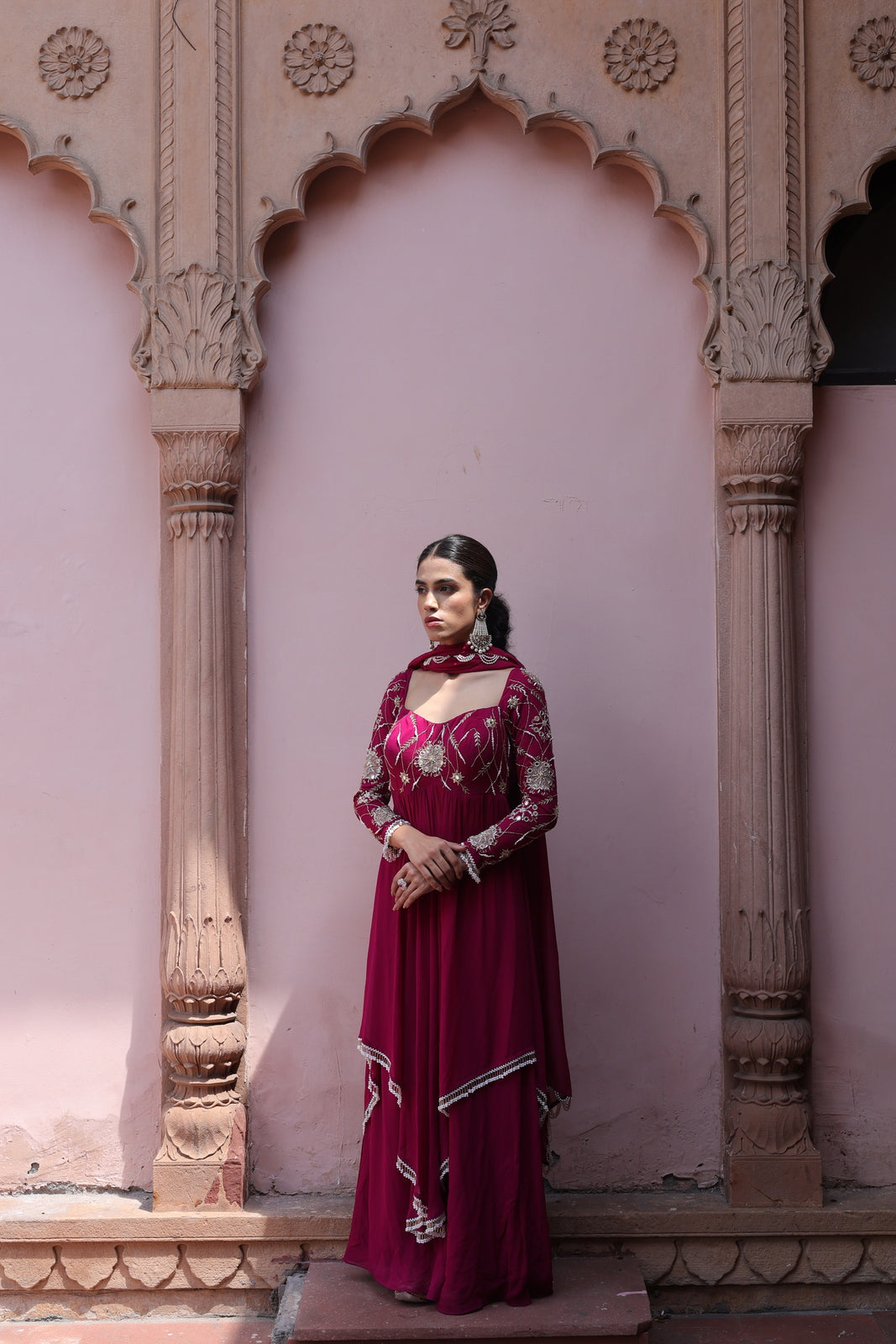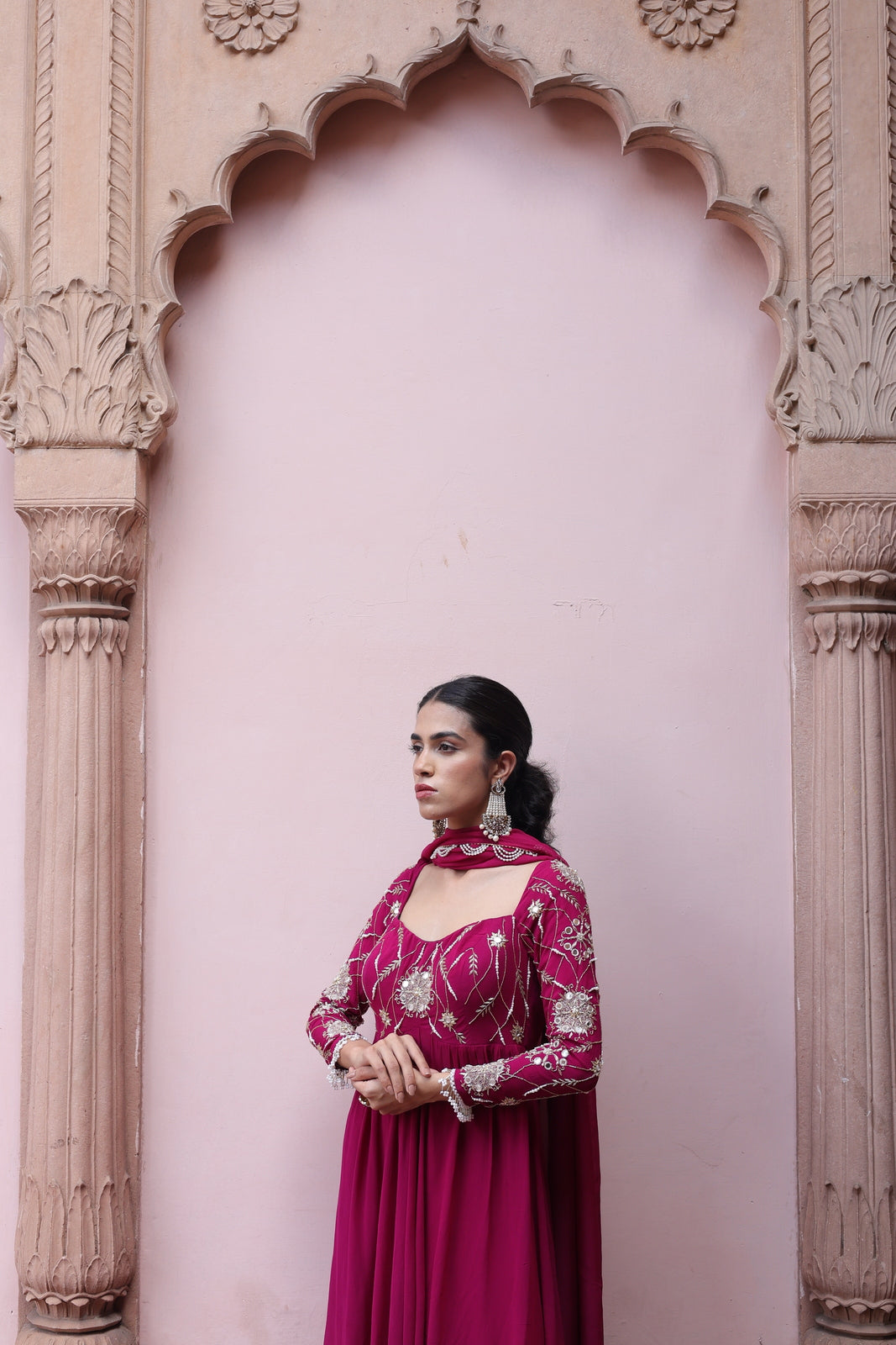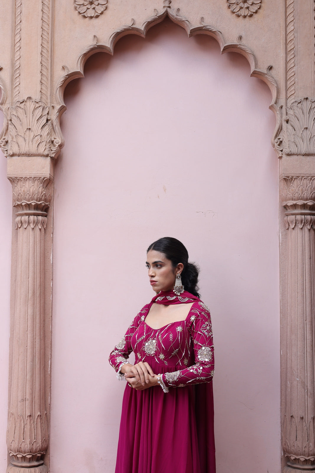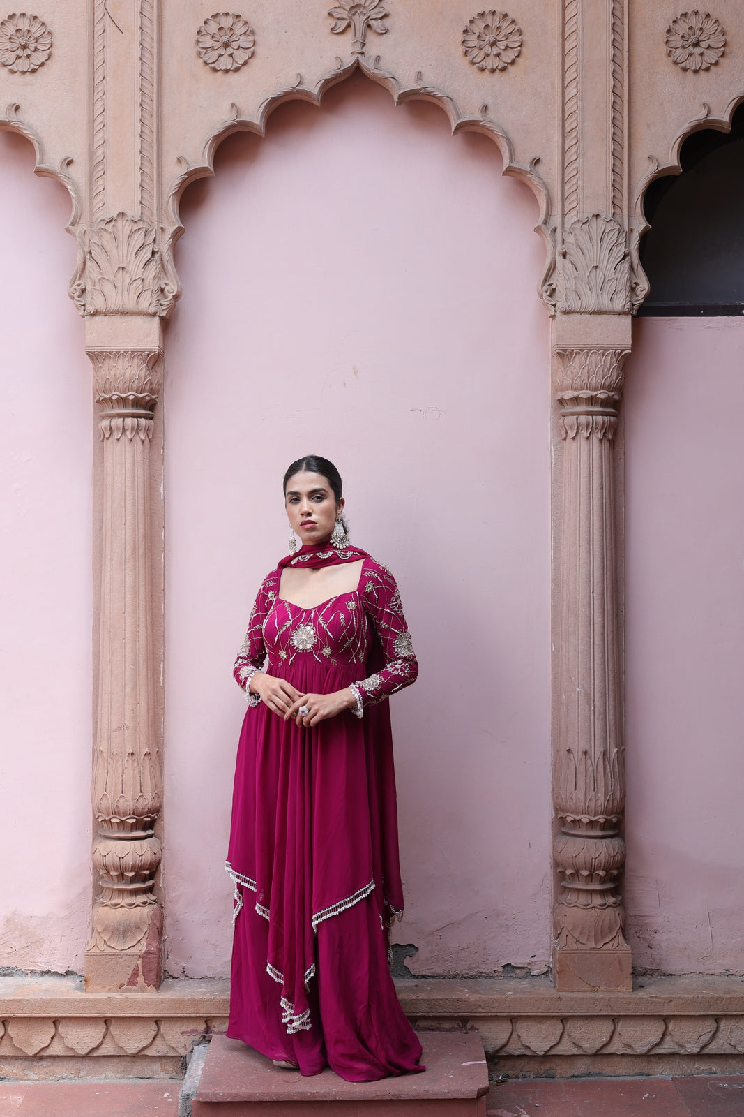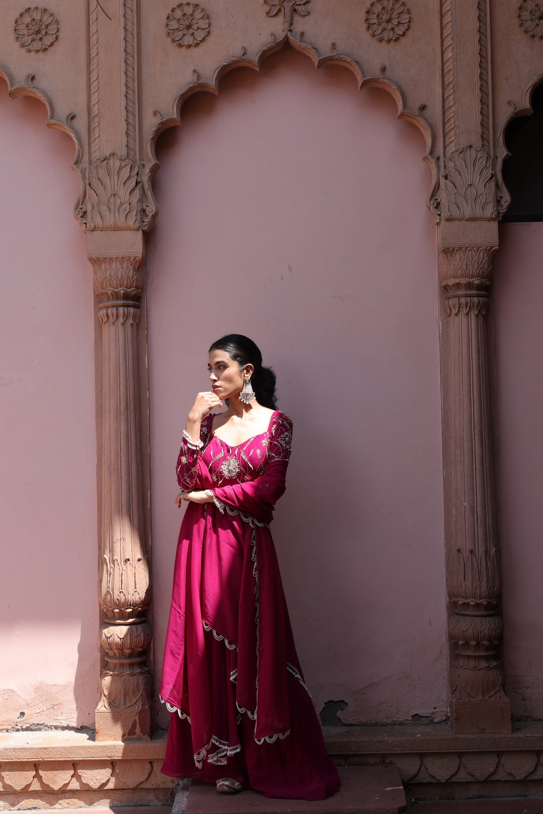 Gulaab means ""rose,"" but this fuchsia isn't delicate garden variety - it's bold, saturated, impossible to ignore. The asymmetrical kurta is cut high-low: shorter at the front for ease of movement, sweeping longer at the back for that photograph-ready drama. The sweetheart neckline is embroidered with gold and silver floral work that creates a jewelry-like effect across the yoke.