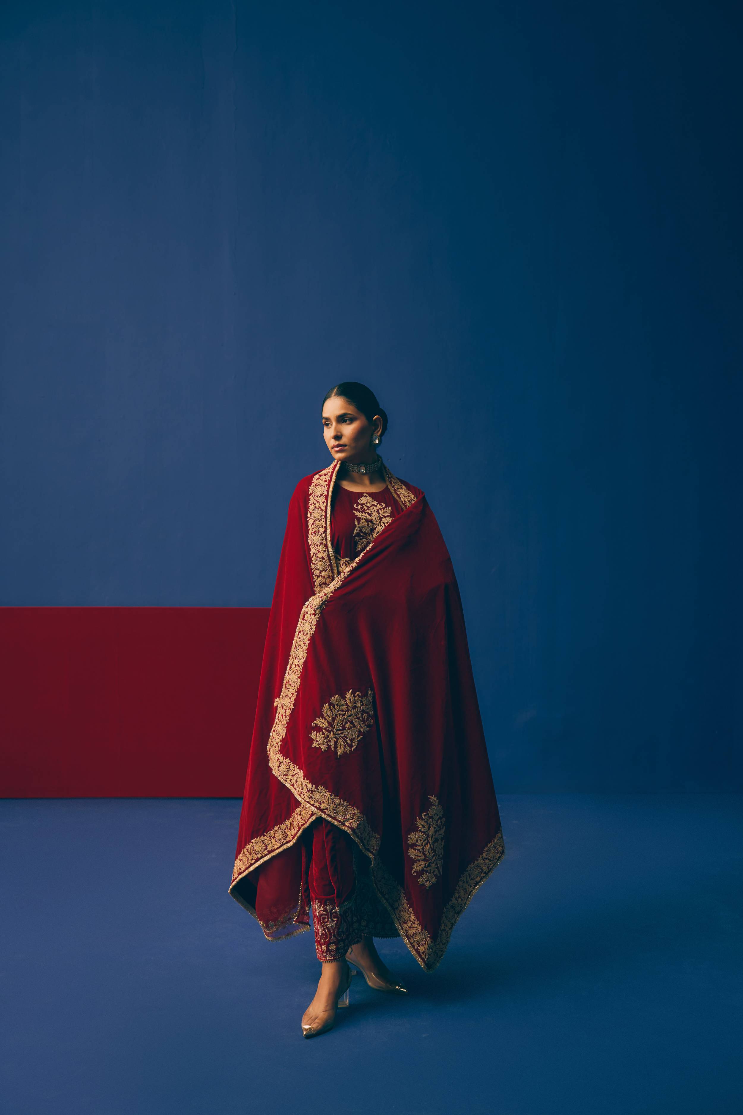 Crafted in deep red silk velvet, this odhni is designed as a statement layering piece for winter ensembles. The velvet base provides a rich, plush texture that drapes gracefully. Intricate dori embroidery adds handcrafted detailing, enhancing its traditional appeal. The depth of colour and embroidery makes it suitable for pairing with festive and bridal outfits. Ideal for weddings, ceremonial occasions, and cultural celebrations. Designed for women who appreciate detailed craftsmanship in accessories. Style it over velvet or silk outfits for a cohesive look.