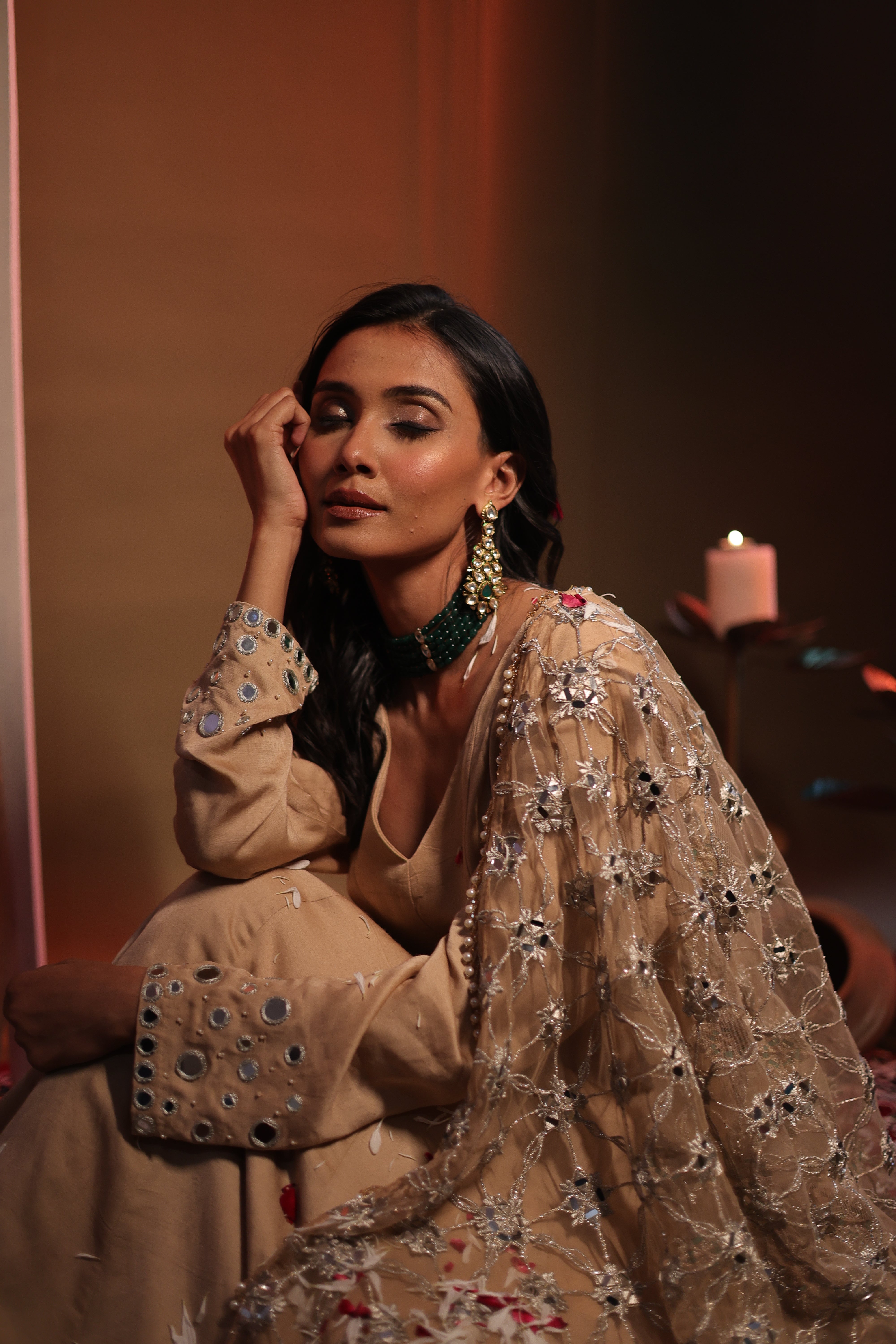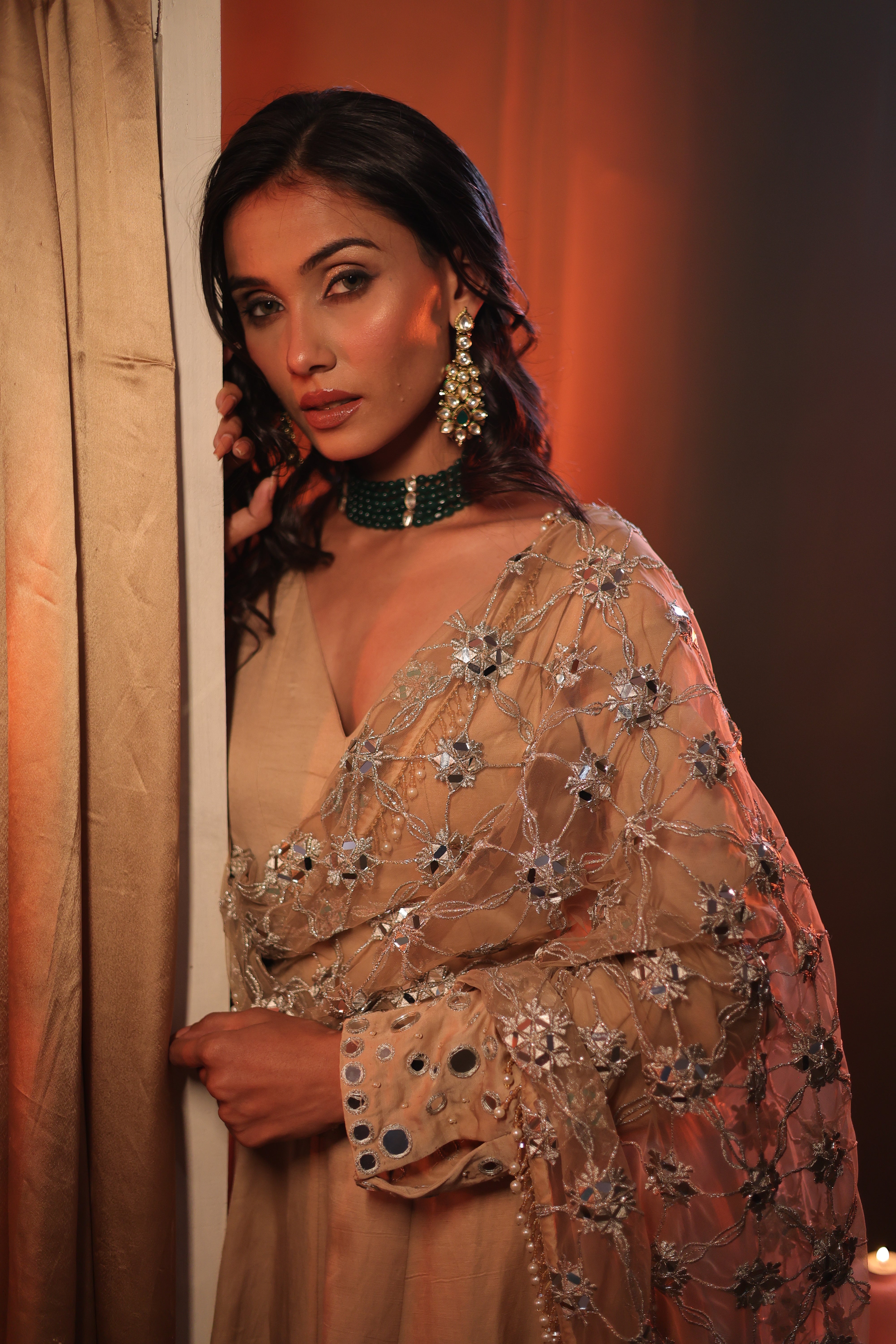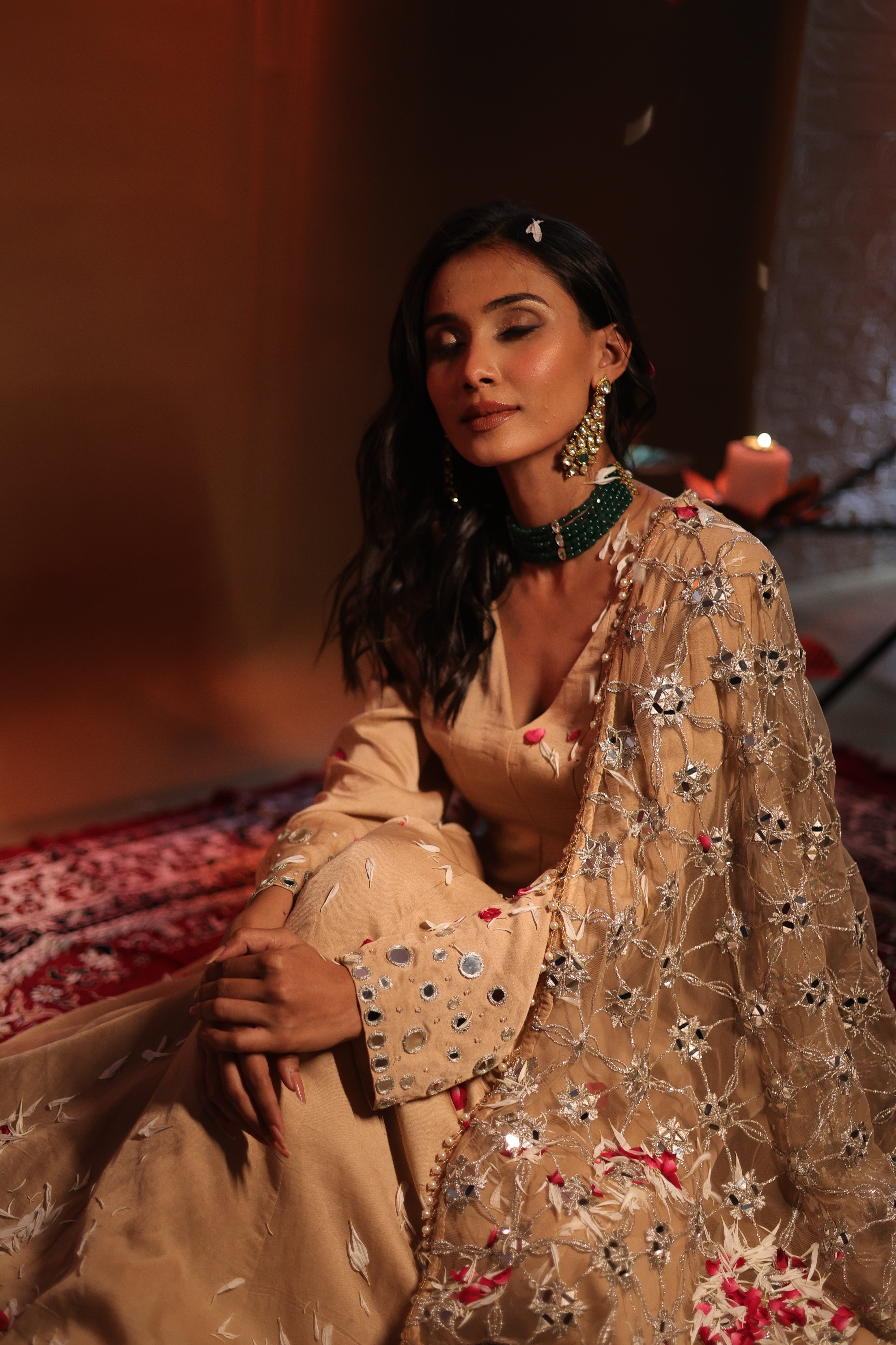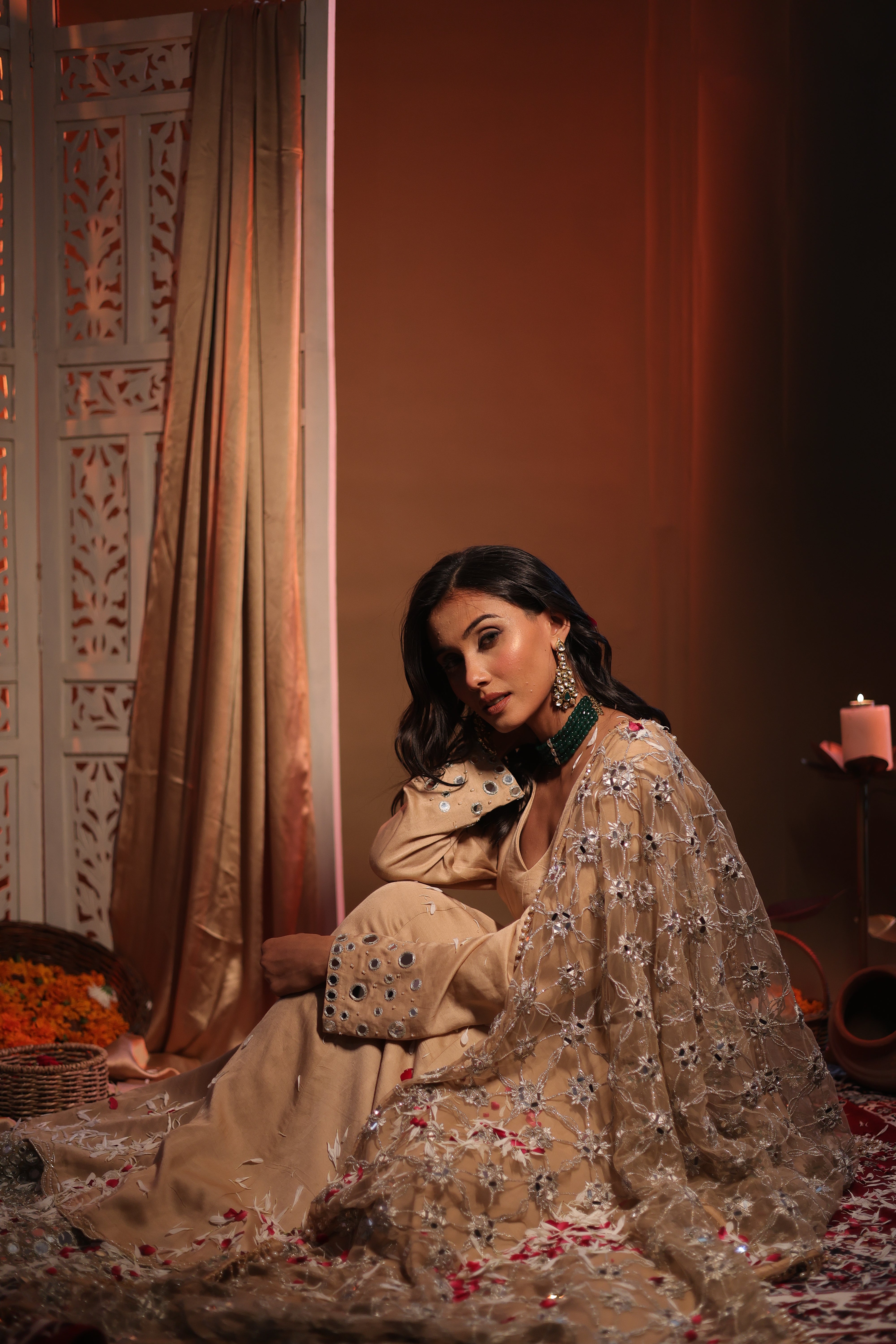 There's a reason Zarnoor photographs like a dream in low light - this champagne anarkali was designed for evening functions where chandeliers matter. The floor-length silhouette flows predictably enough: fitted V-neck bodice, pleated skirt. Standard anarkali territory until you notice the double mirror border at the hem that catches every bit of available light and throws it back harder.