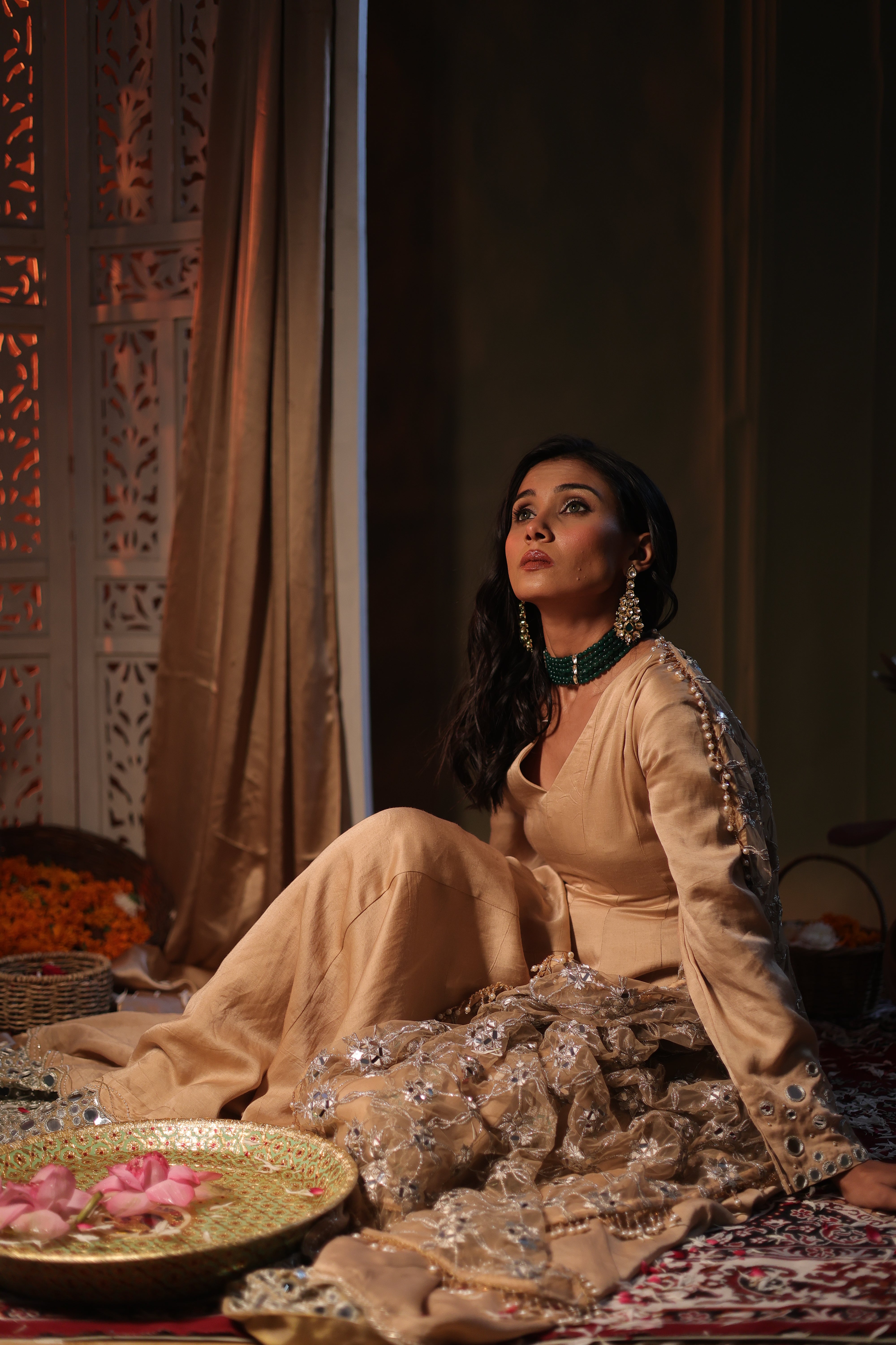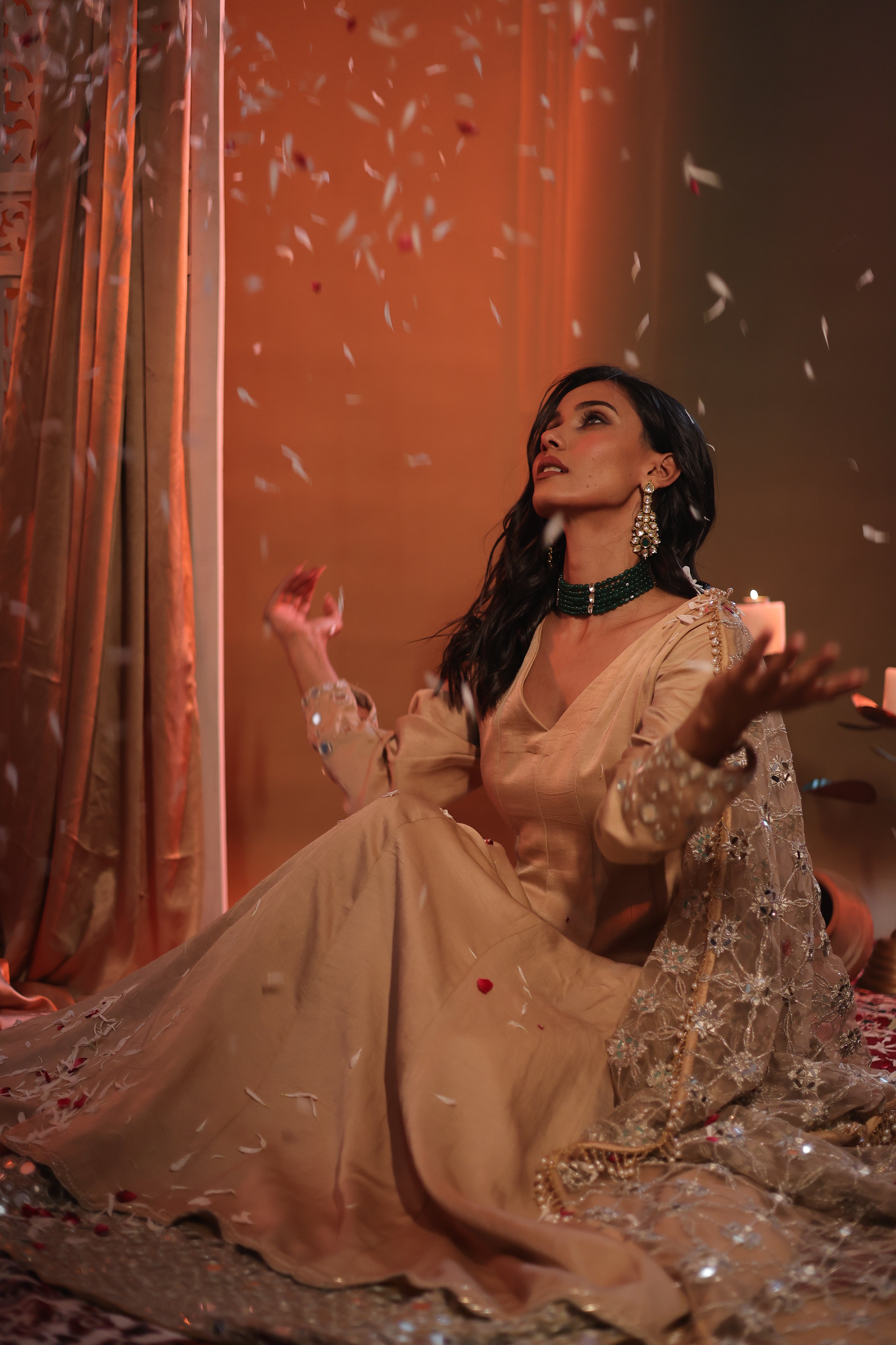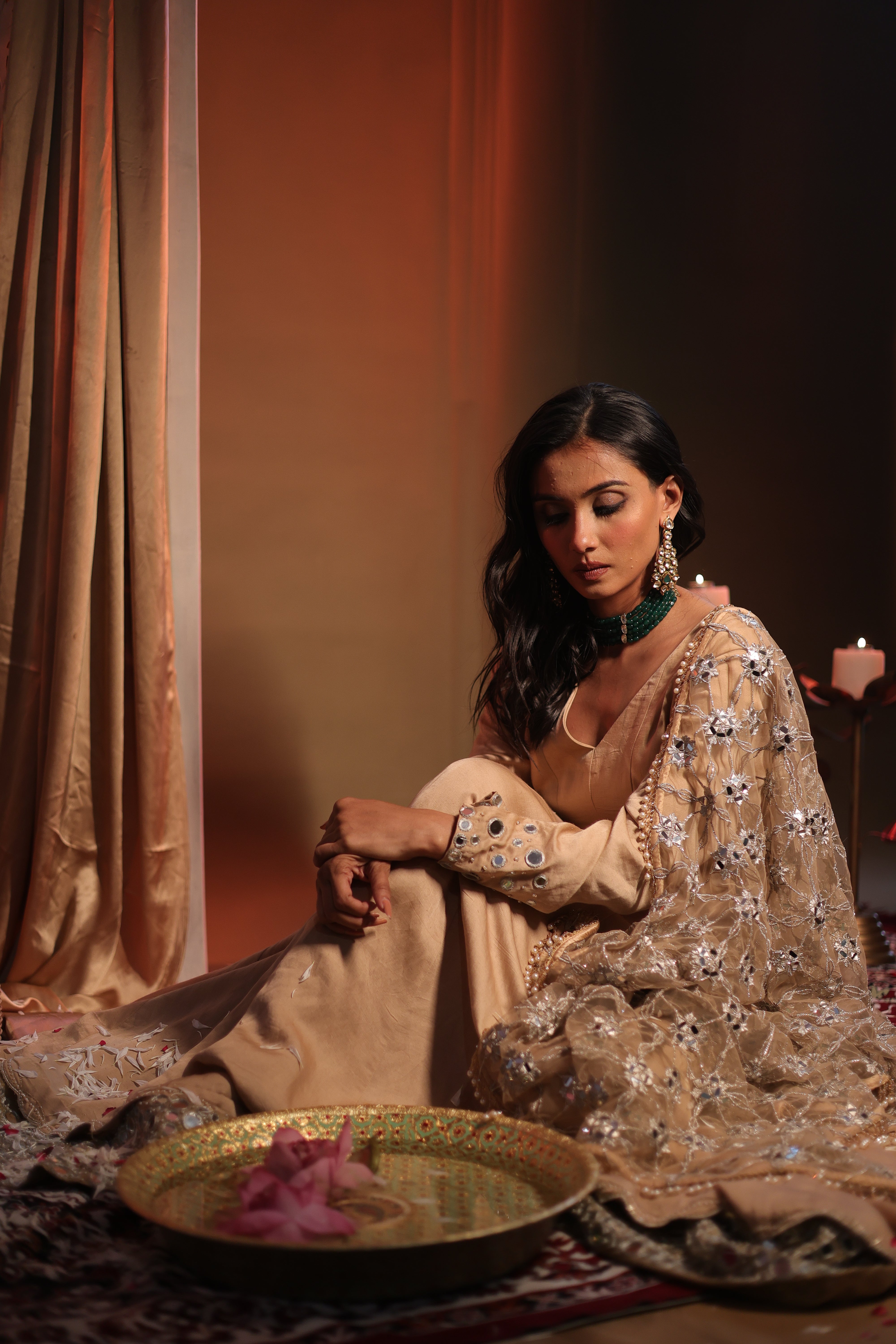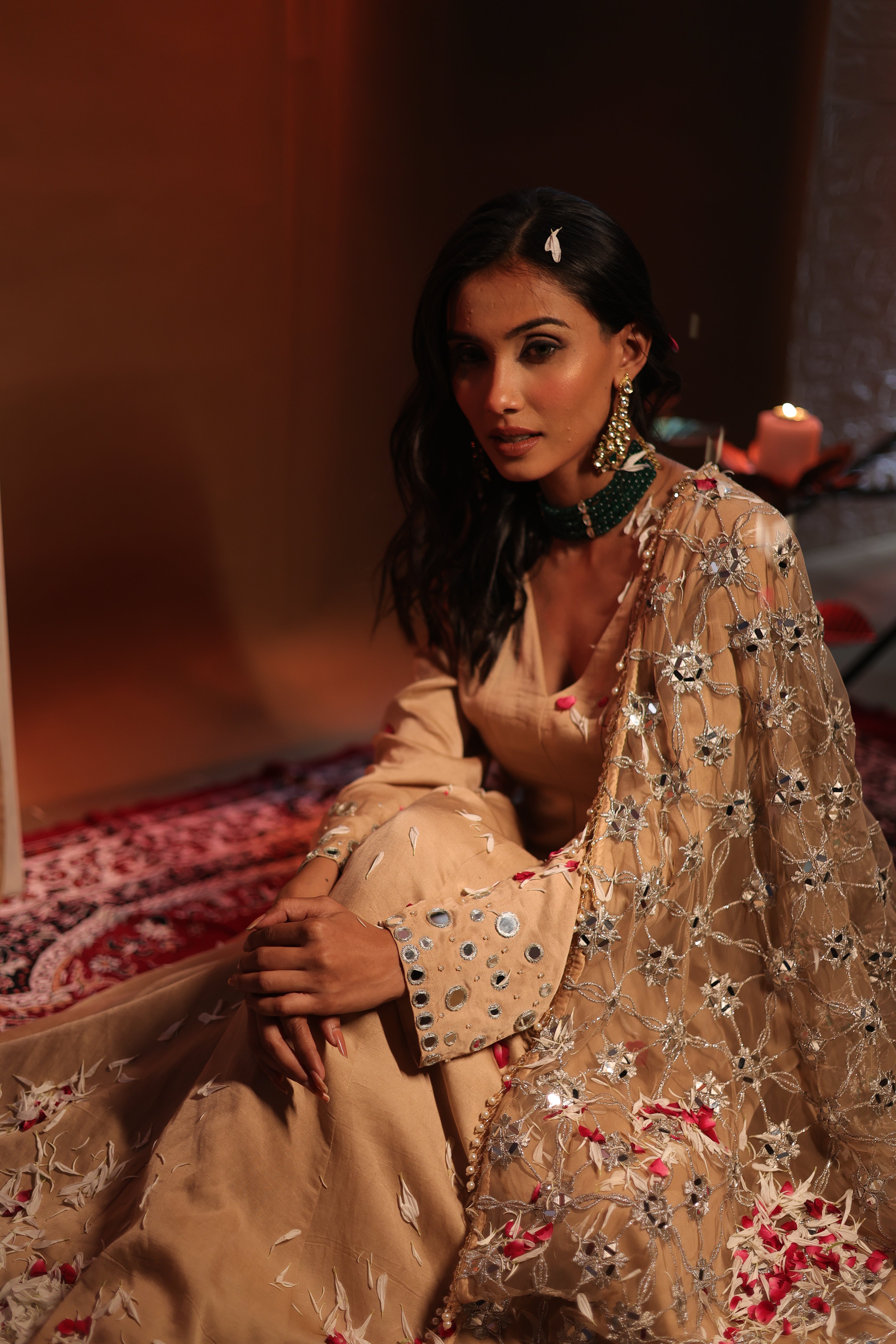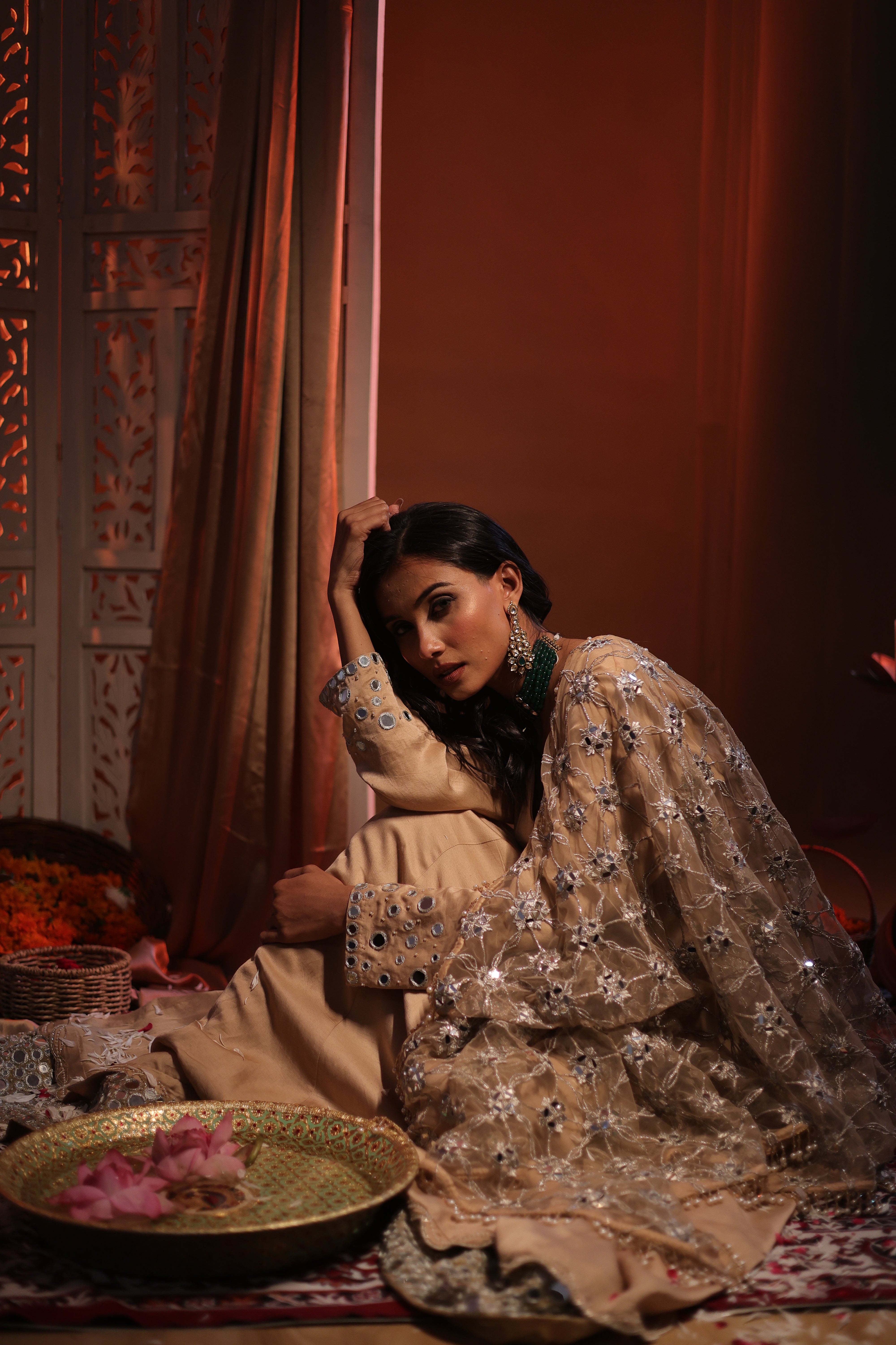 There's a reason Zarnoor photographs like a dream in low light - this champagne anarkali was designed for evening functions where chandeliers matter. The floor-length silhouette flows predictably enough: fitted V-neck bodice, pleated skirt. Standard anarkali territory until you notice the double mirror border at the hem that catches every bit of available light and throws it back harder.