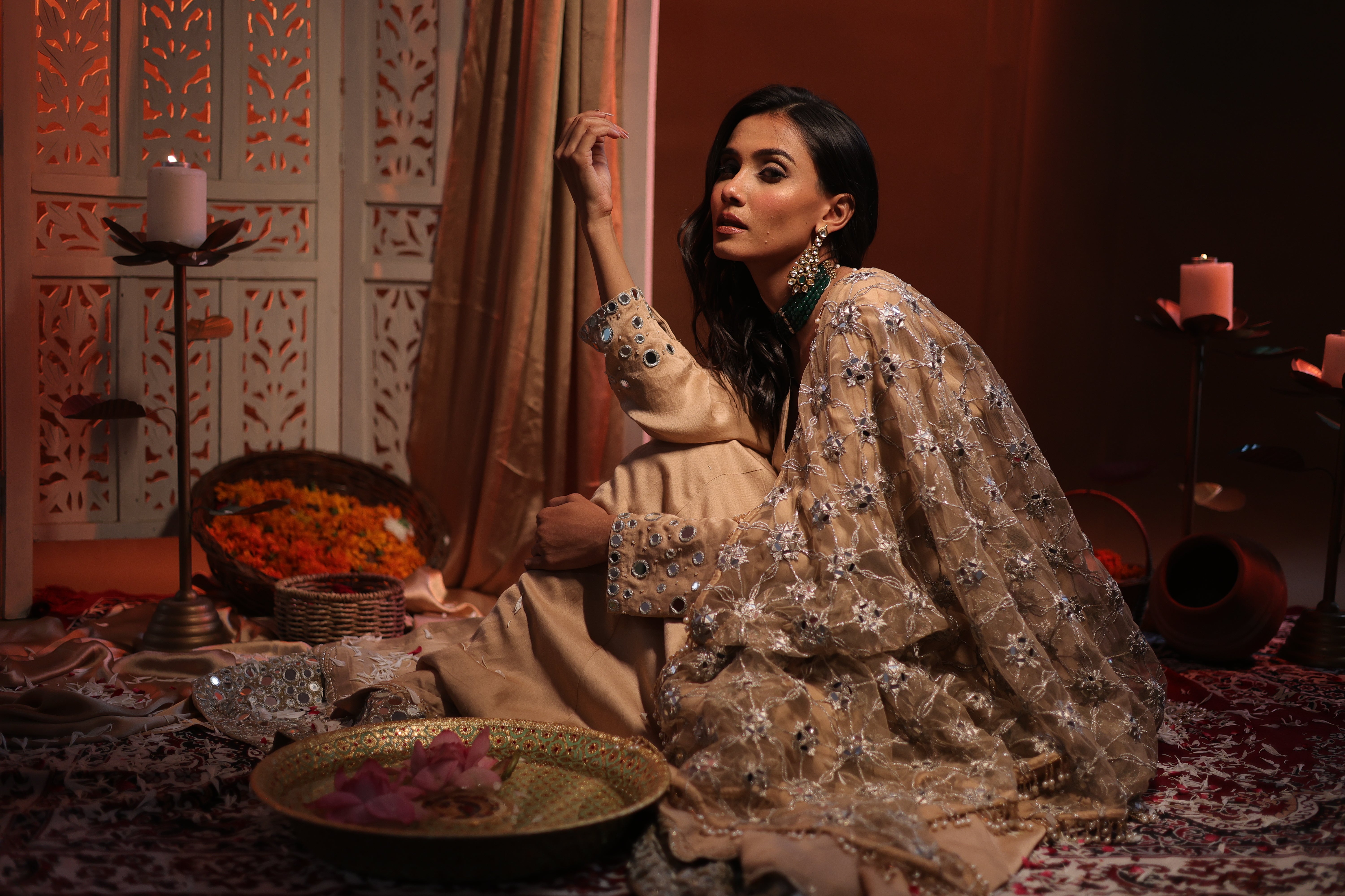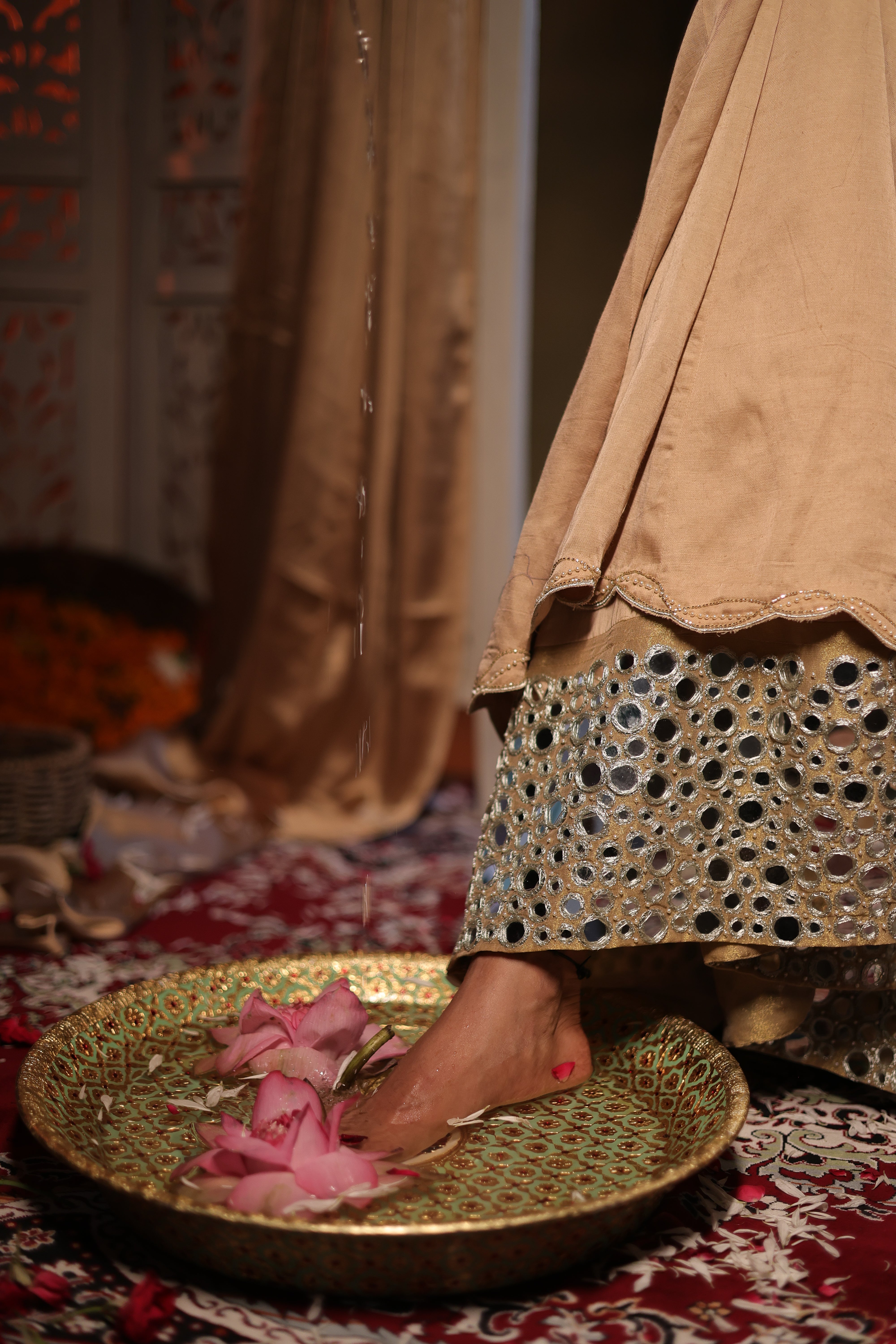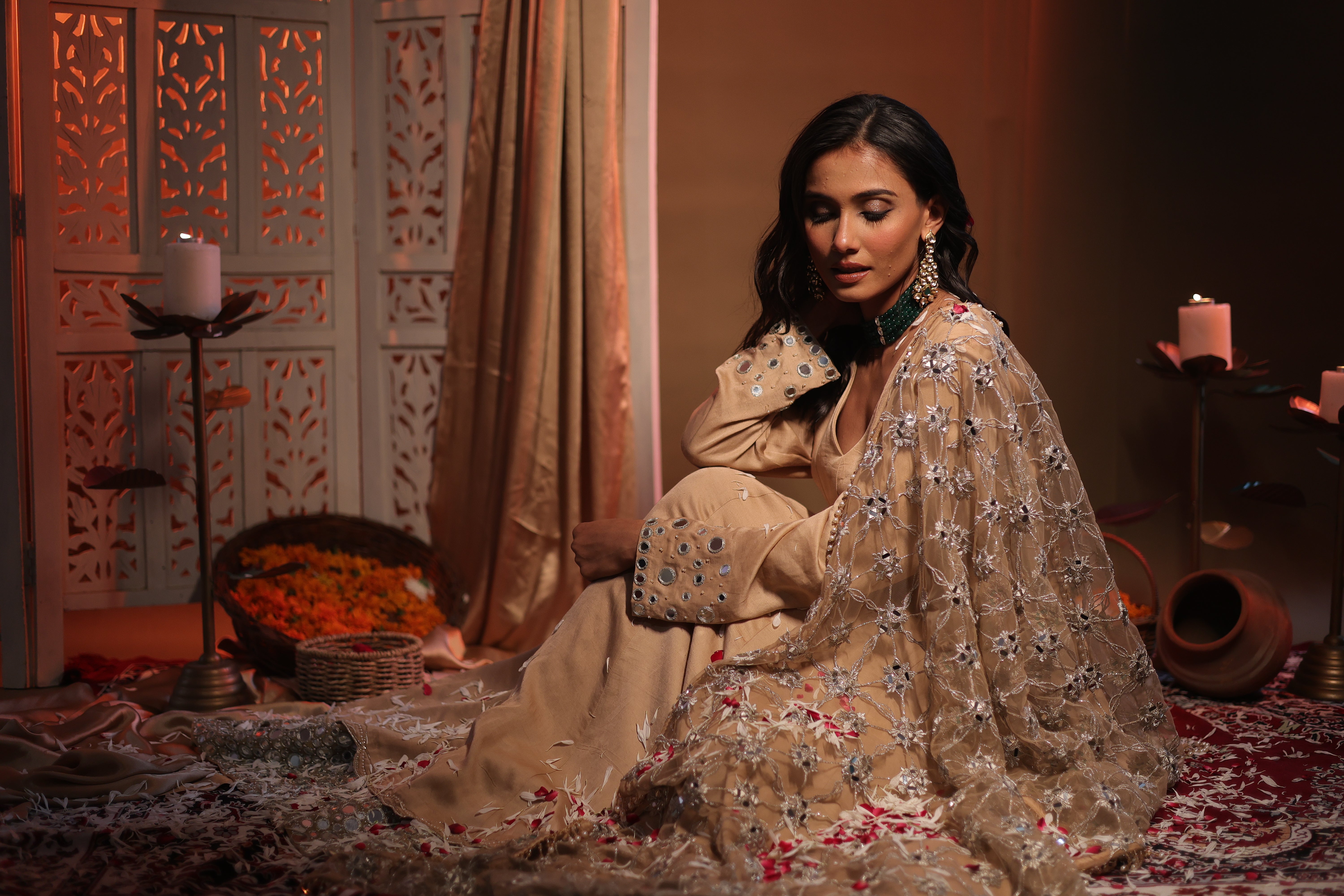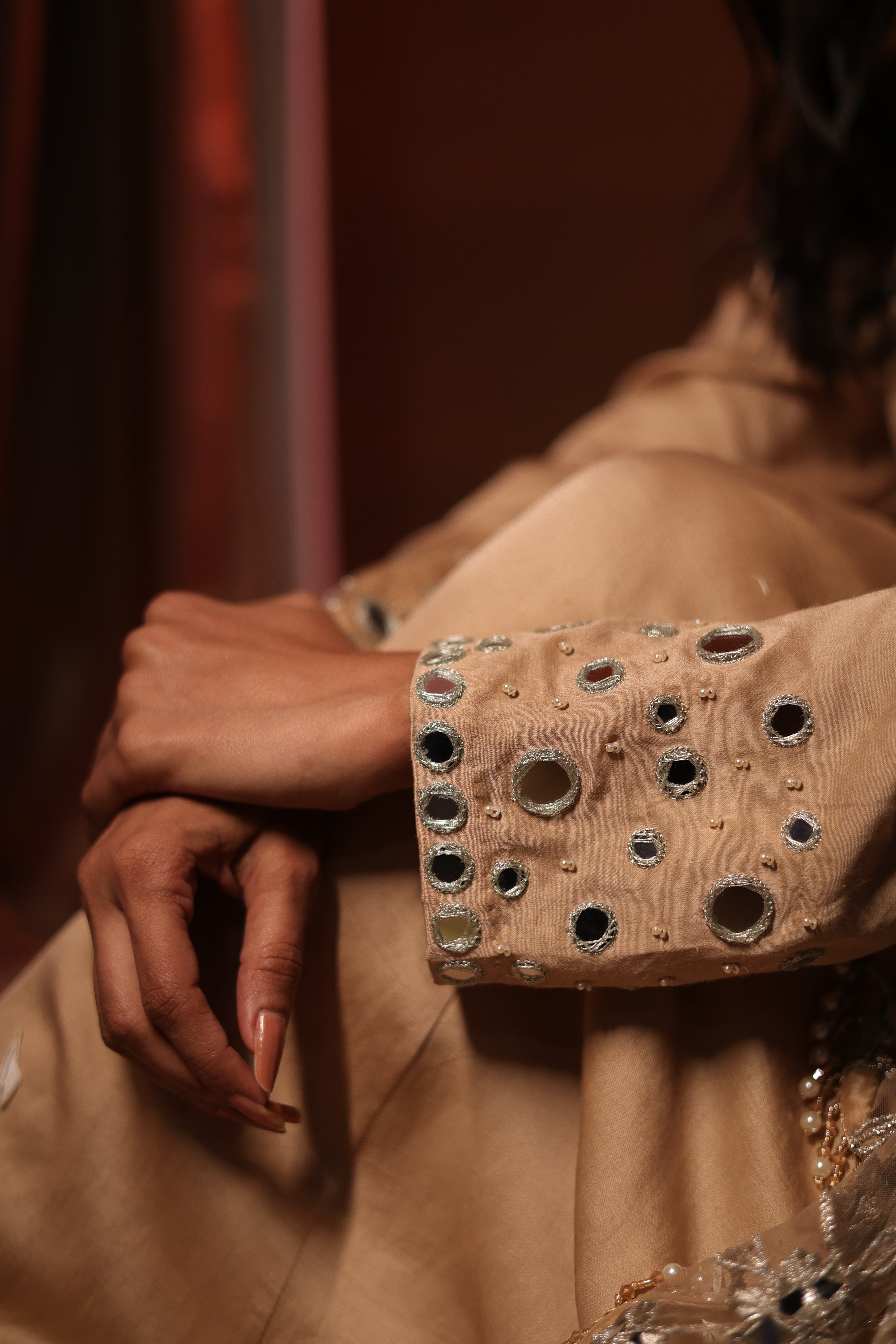 Wear this to evening receptions. Night ceremonies. Functions that start after 7 PM and involve professional photography. Zarnoor knows what candlelight and camera flashes do to mirror work, and designed accordingly.