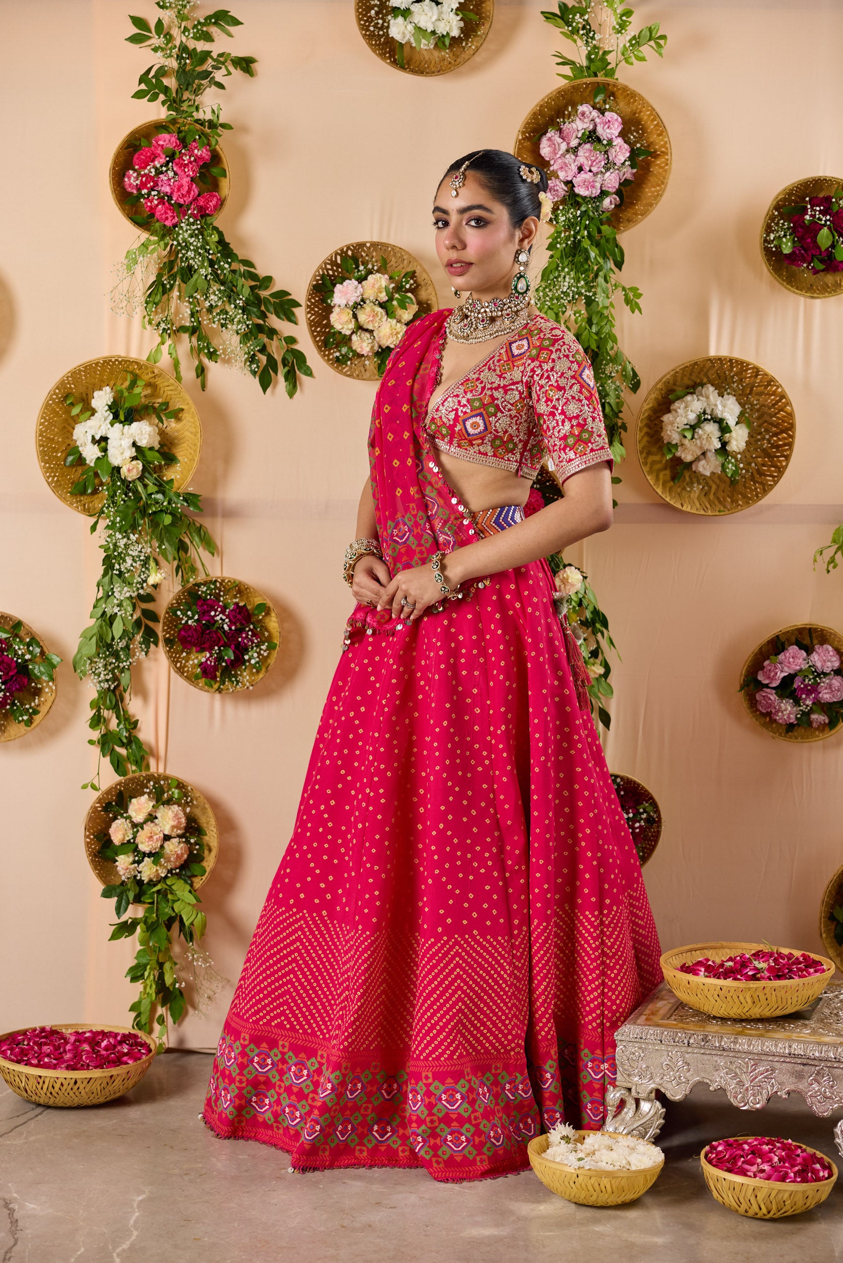 The bandhej dupatta echoes the lehenga's pattern with scattered gold dots and decorative embellishments, finished with playful tassel trim.