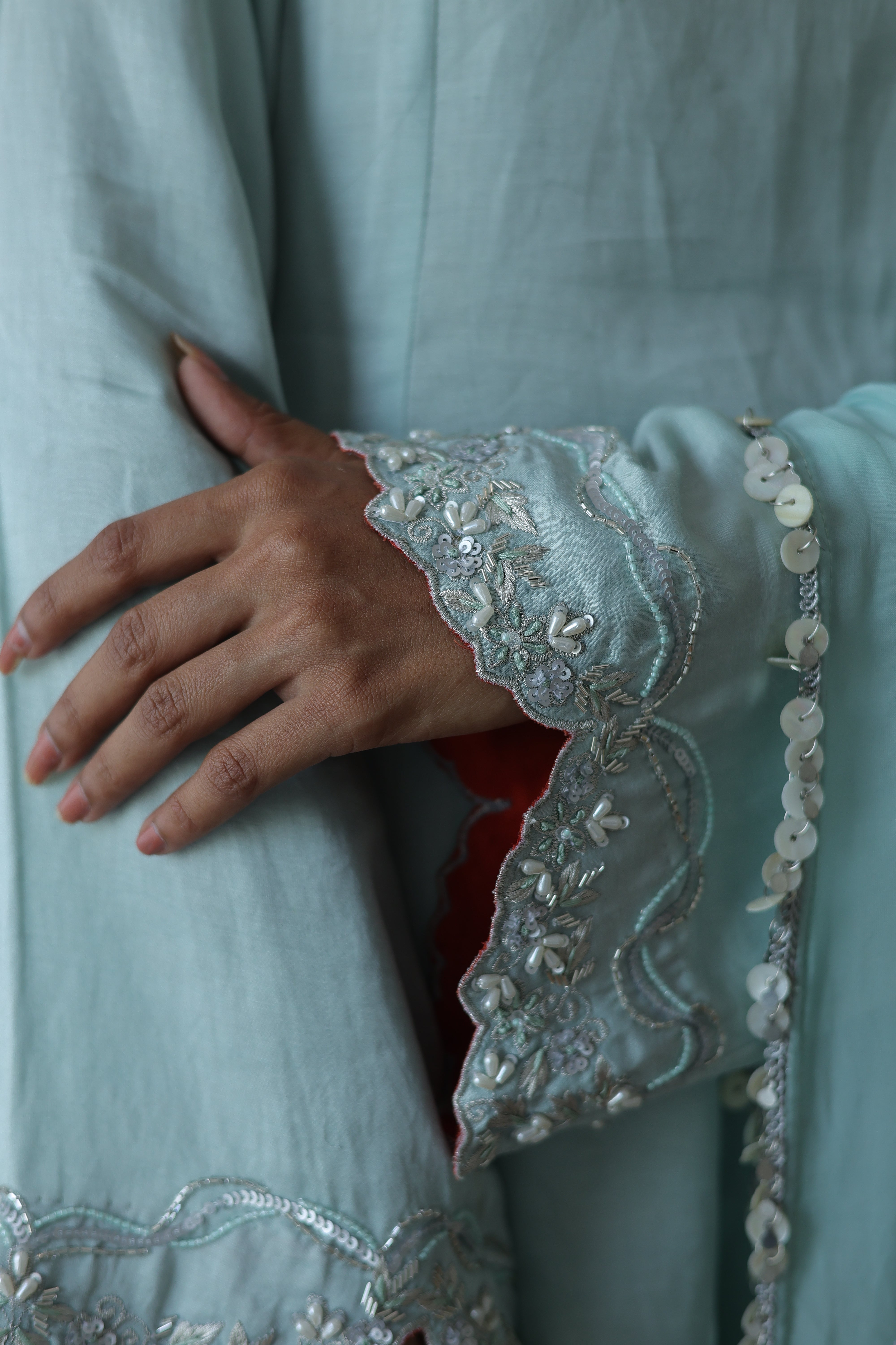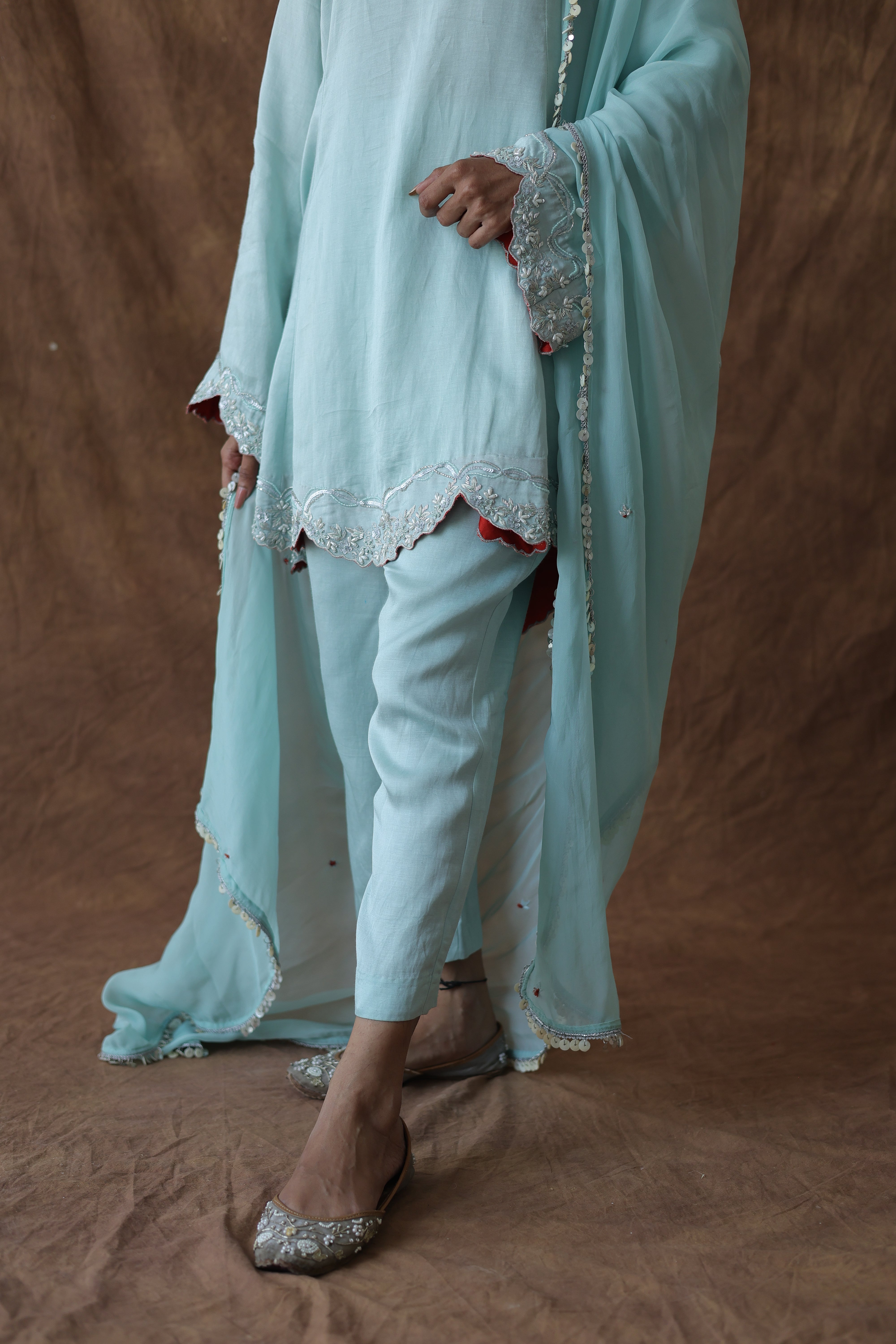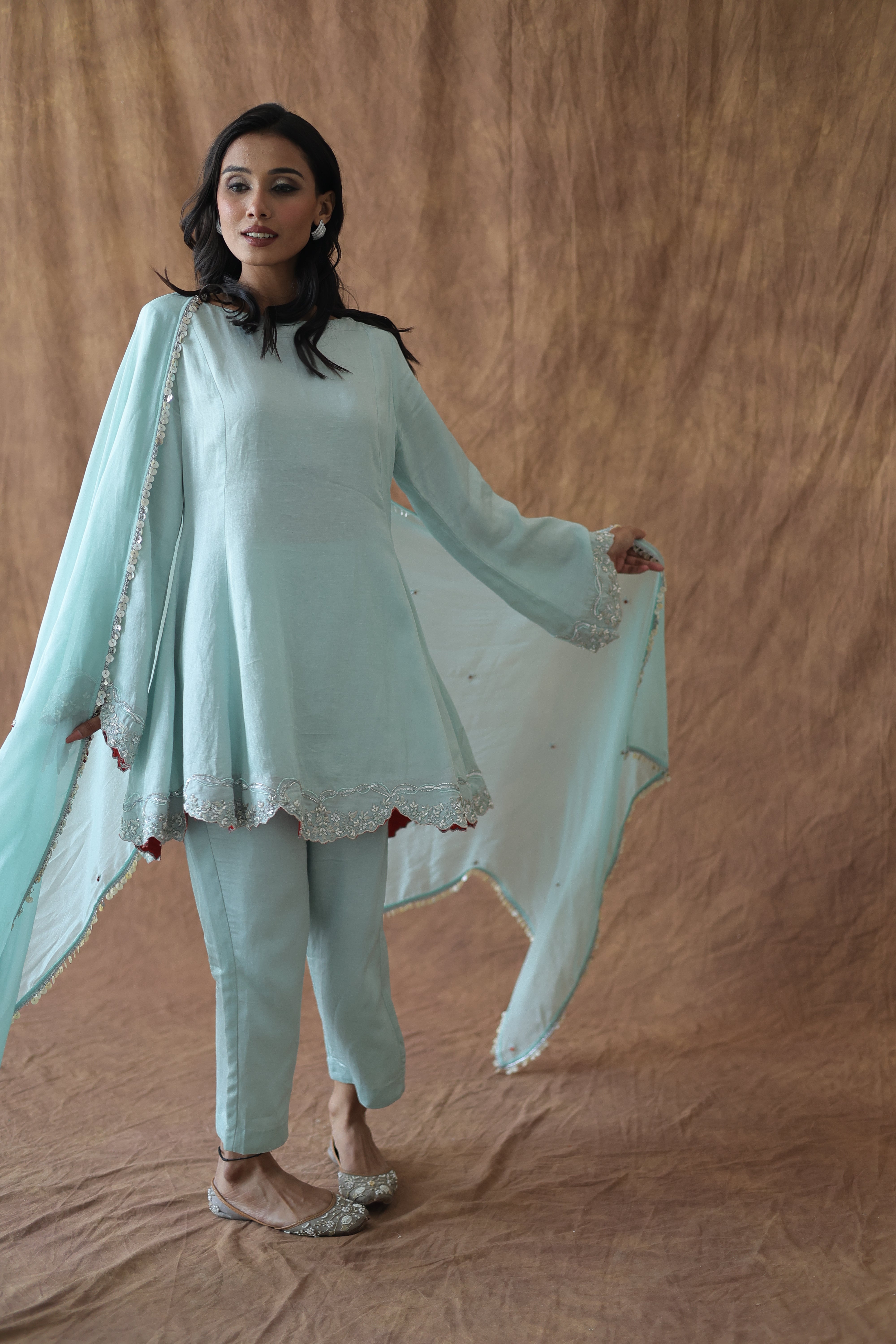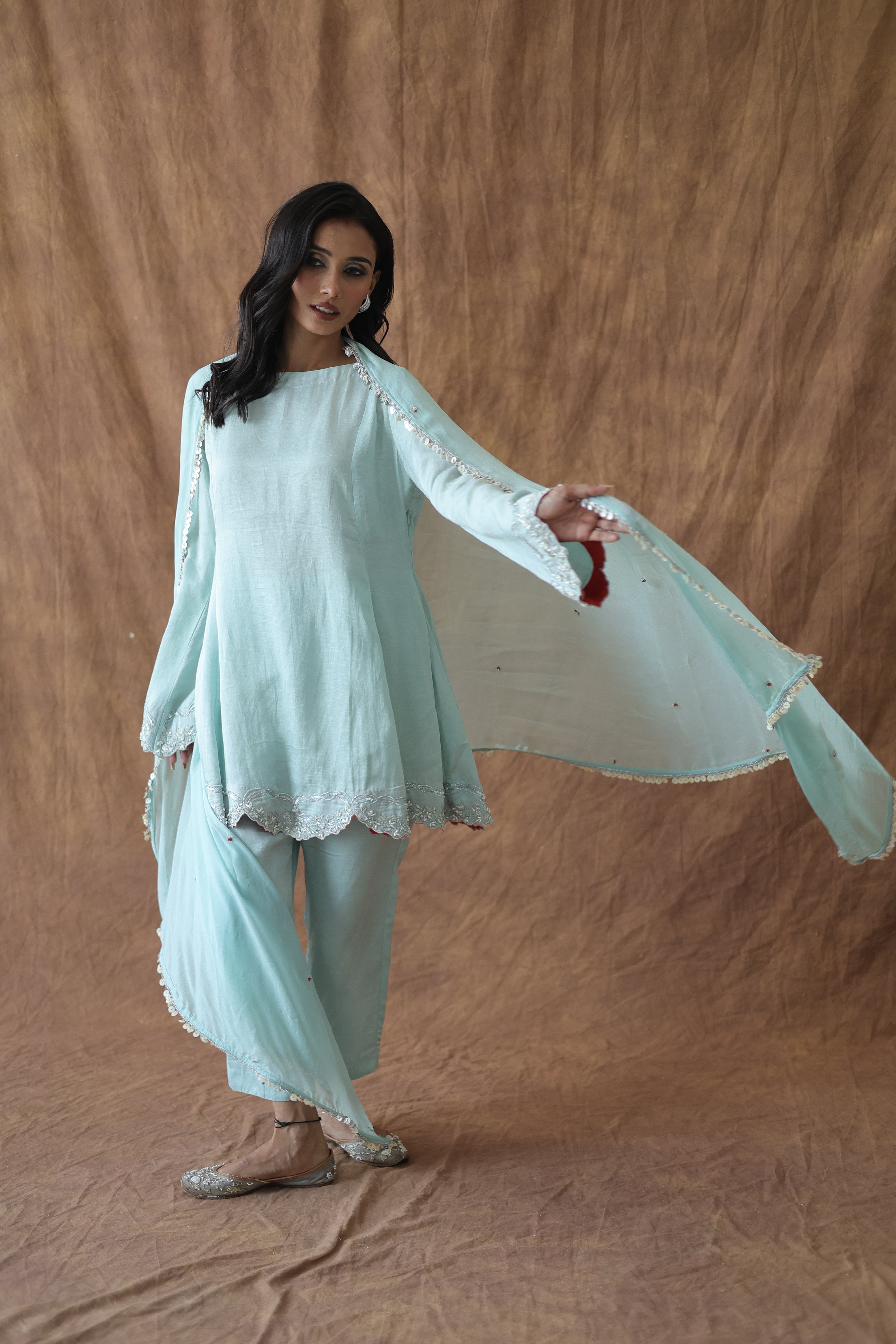 Aafreen takes the kali silhouette and makes it daytime-friendly. This sage green linen silk kurta hits at the hip, featuring an A-line flare that creates shape without overwhelming a petite frame. The scalloped hem and bell sleeve edges are finished with silver embroidery, while peek-a-boo rust lining at the cuffs adds unexpected warmth.