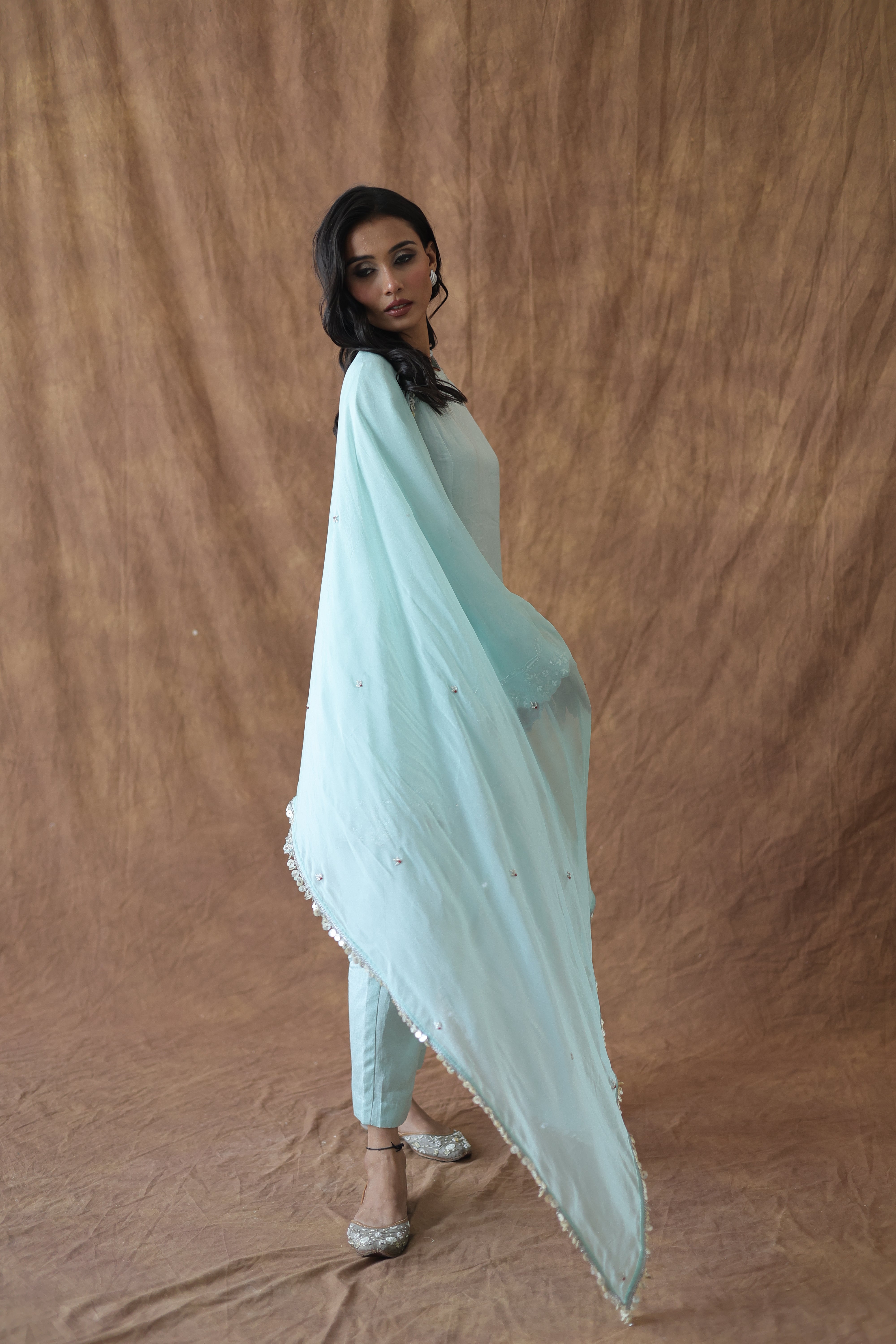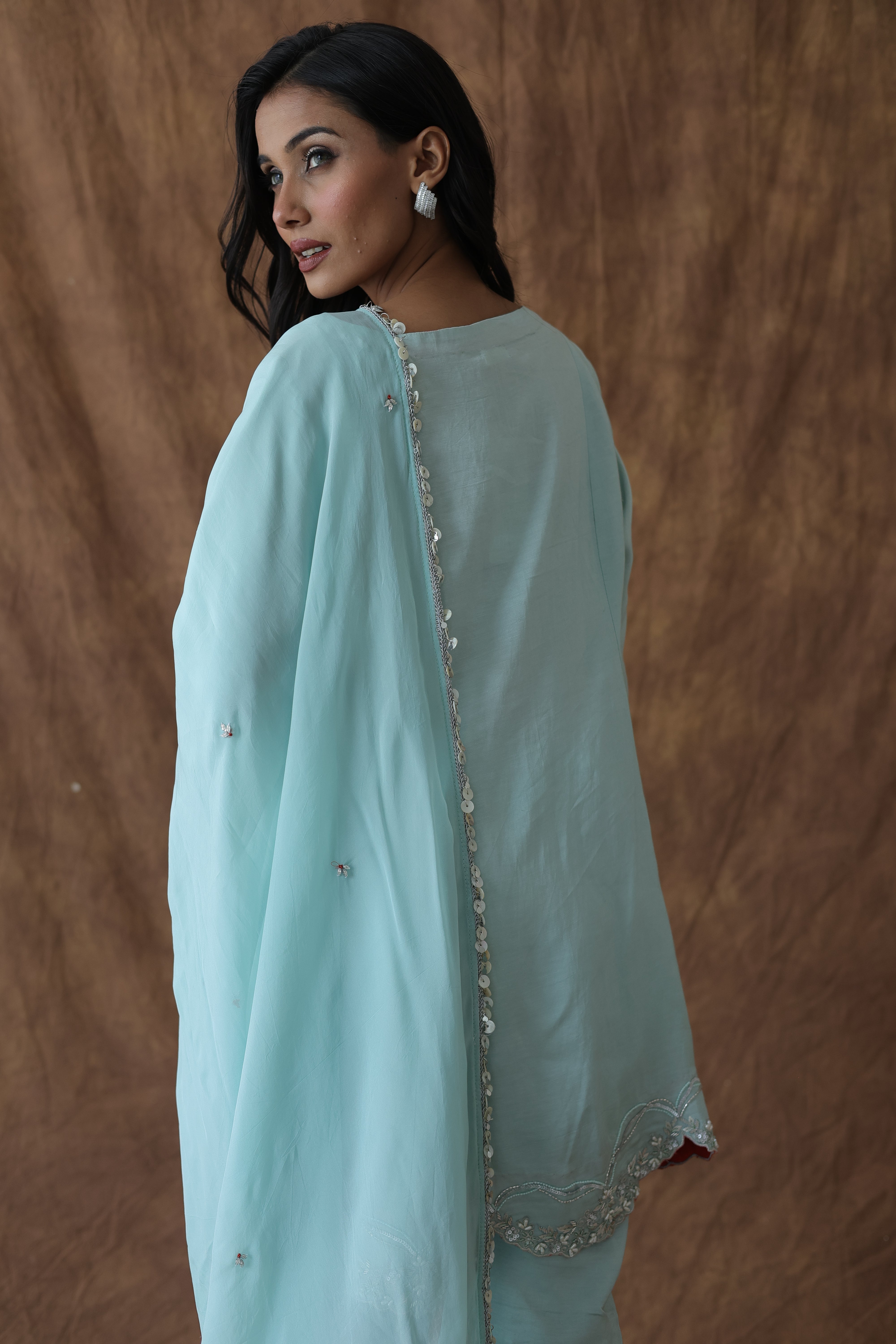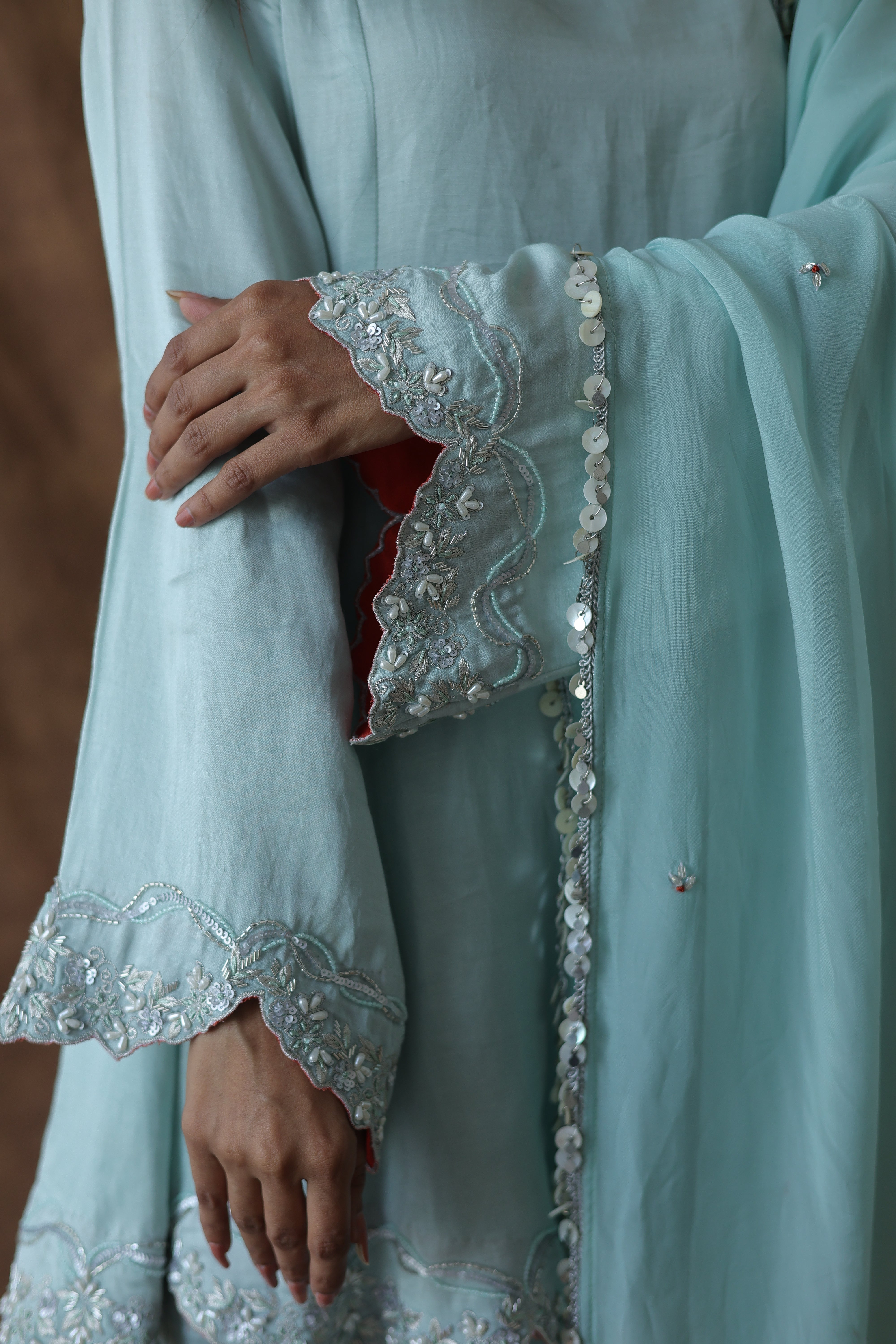The organza dupatta with matching scalloped edges completes the look but isn't mandatory. You could wear this without it and still feel fully dressed.
