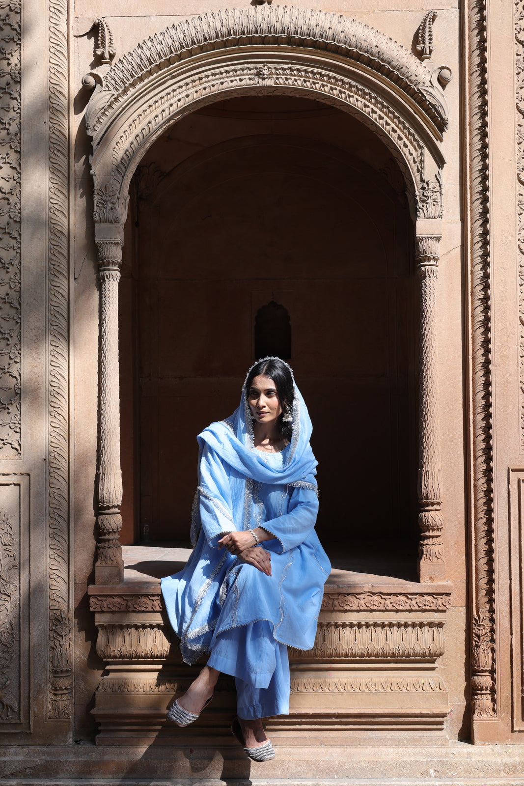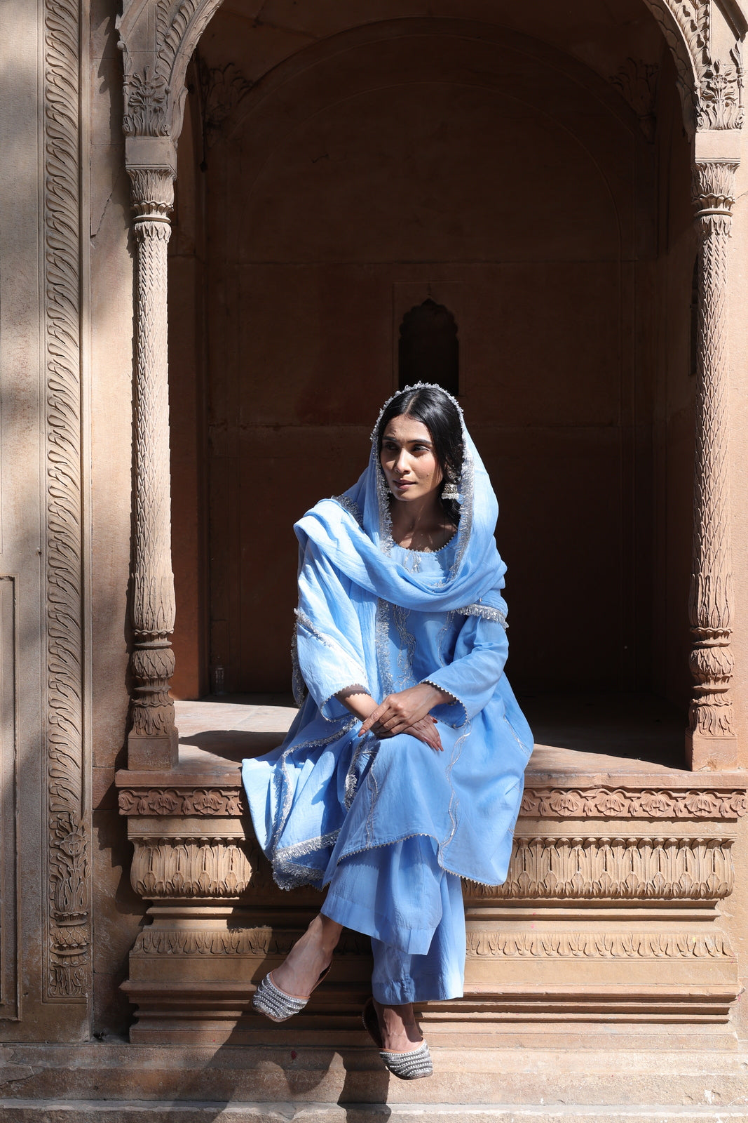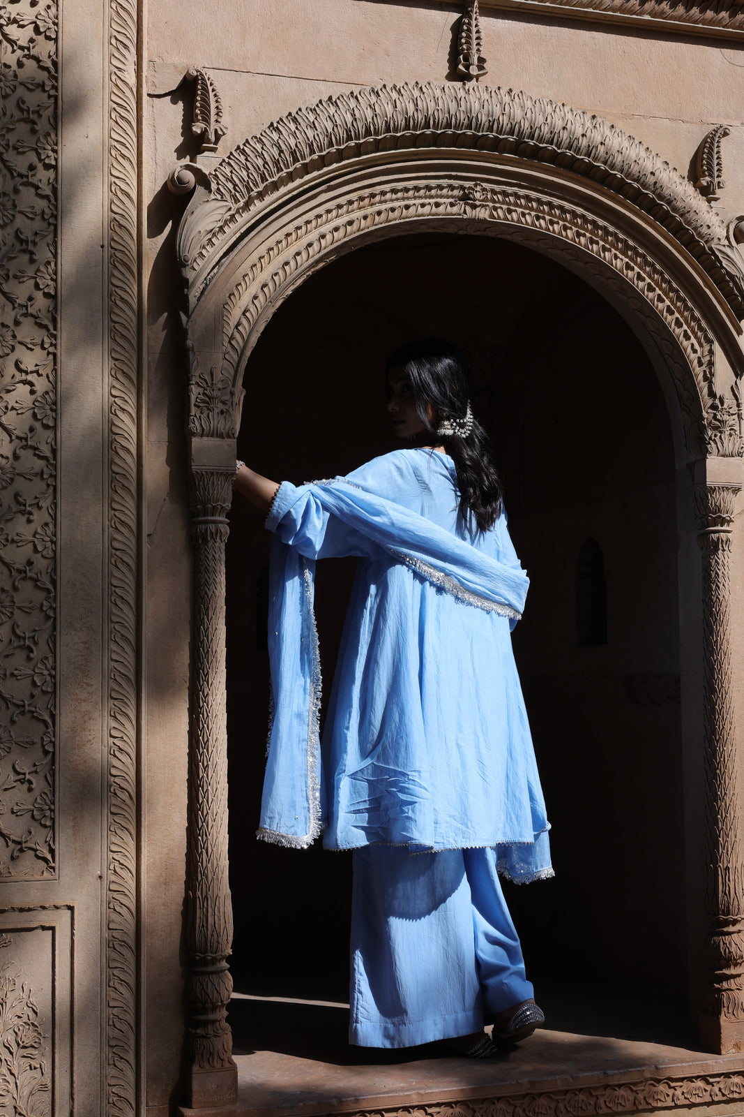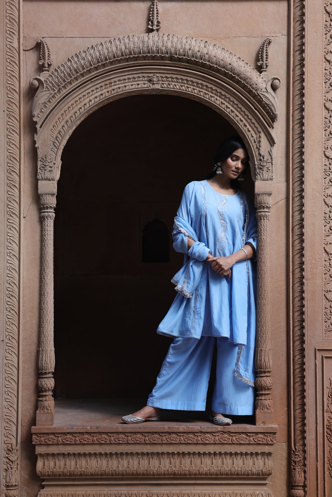 The Zehra set is for women who want festive without the fuss. This powder blue mul chanderi ensemble features a short kalidar kurta that flares gently from the waist, paired with wide-leg palazzo pants instead of traditional salwar. The result? Movement, ease, and a silhouette that feels distinctly modern.