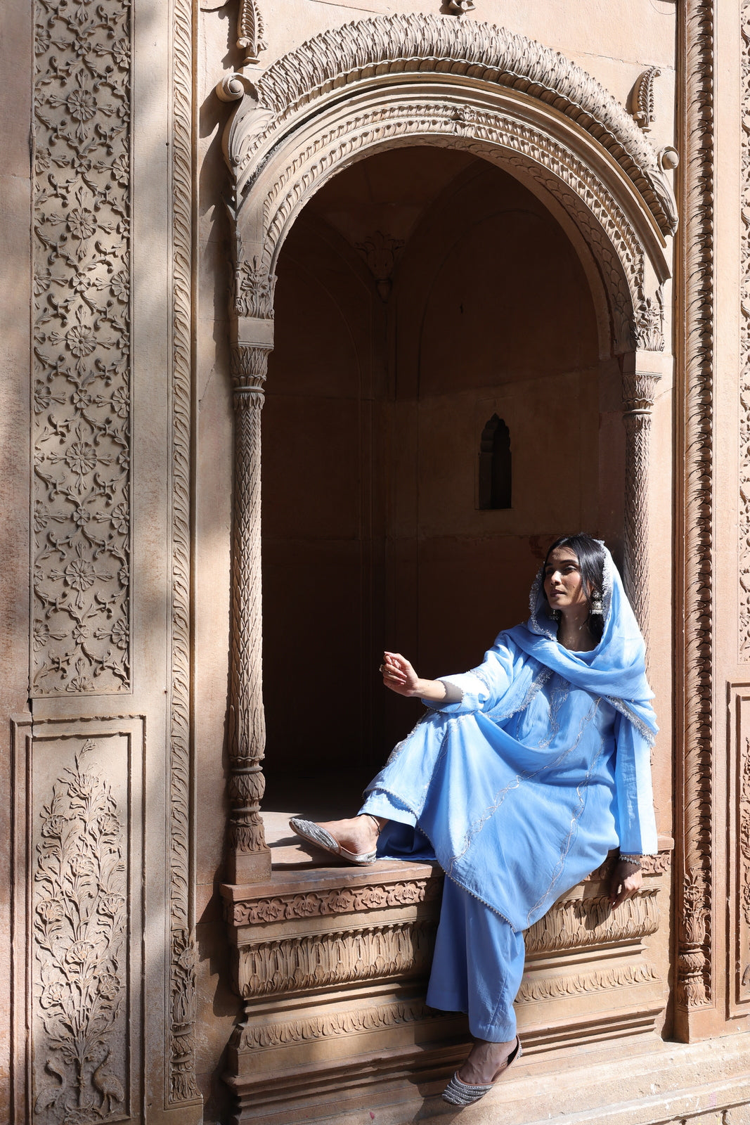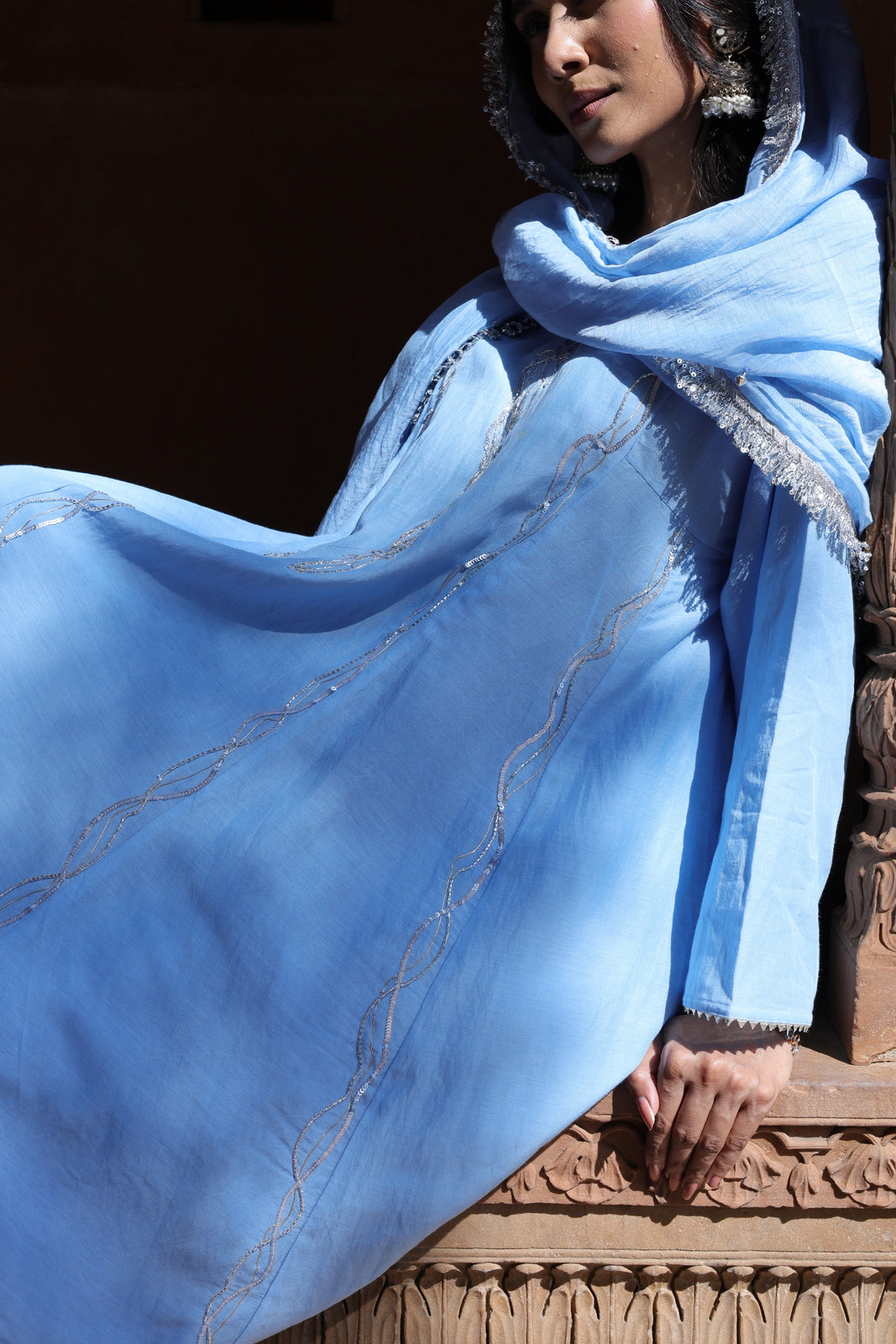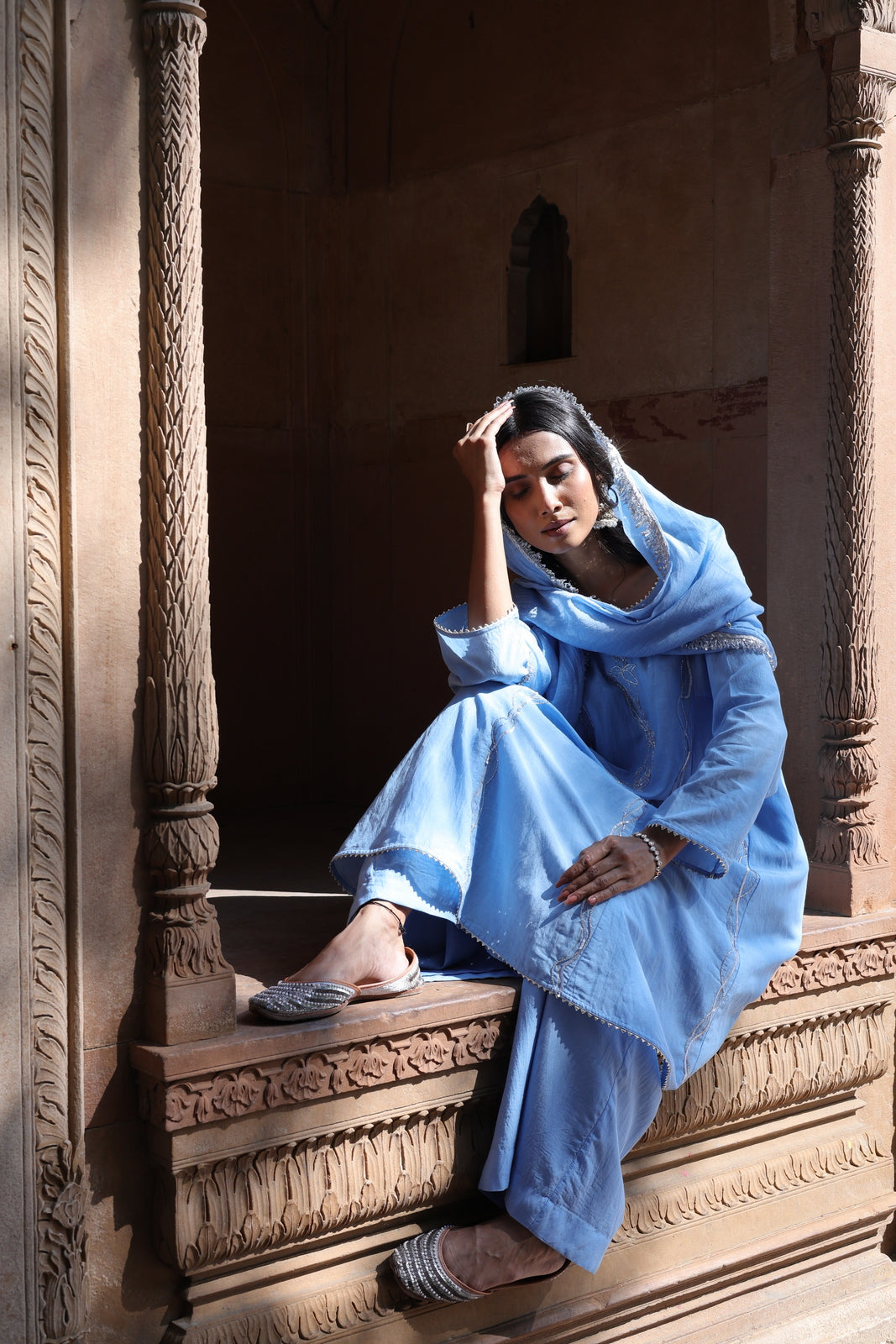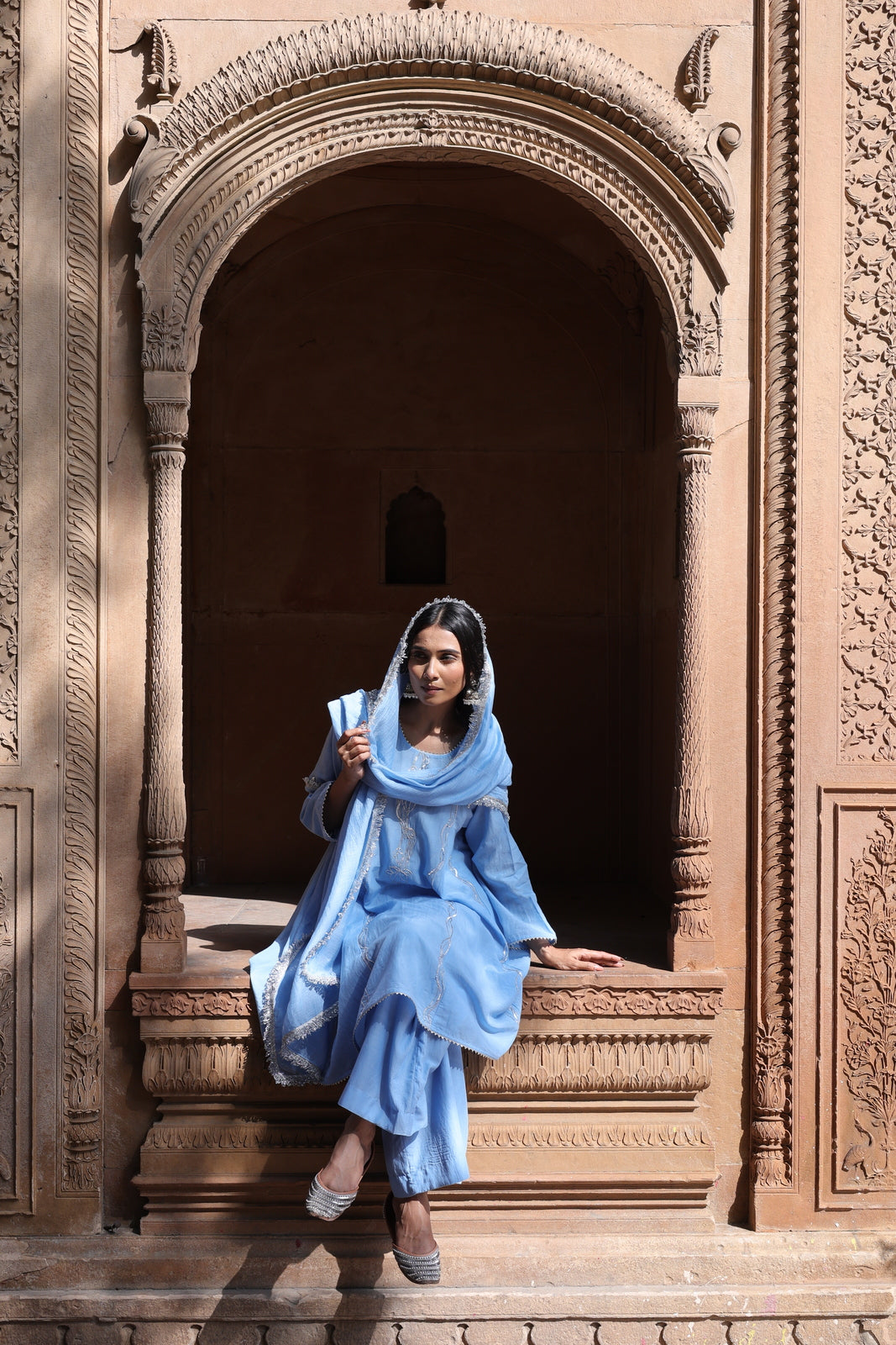 The Zehra set is for women who want festive without the fuss. This powder blue mul chanderi ensemble features a short kalidar kurta that flares gently from the waist, paired with wide-leg palazzo pants instead of traditional salwar. The result? Movement, ease, and a silhouette that feels distinctly modern.