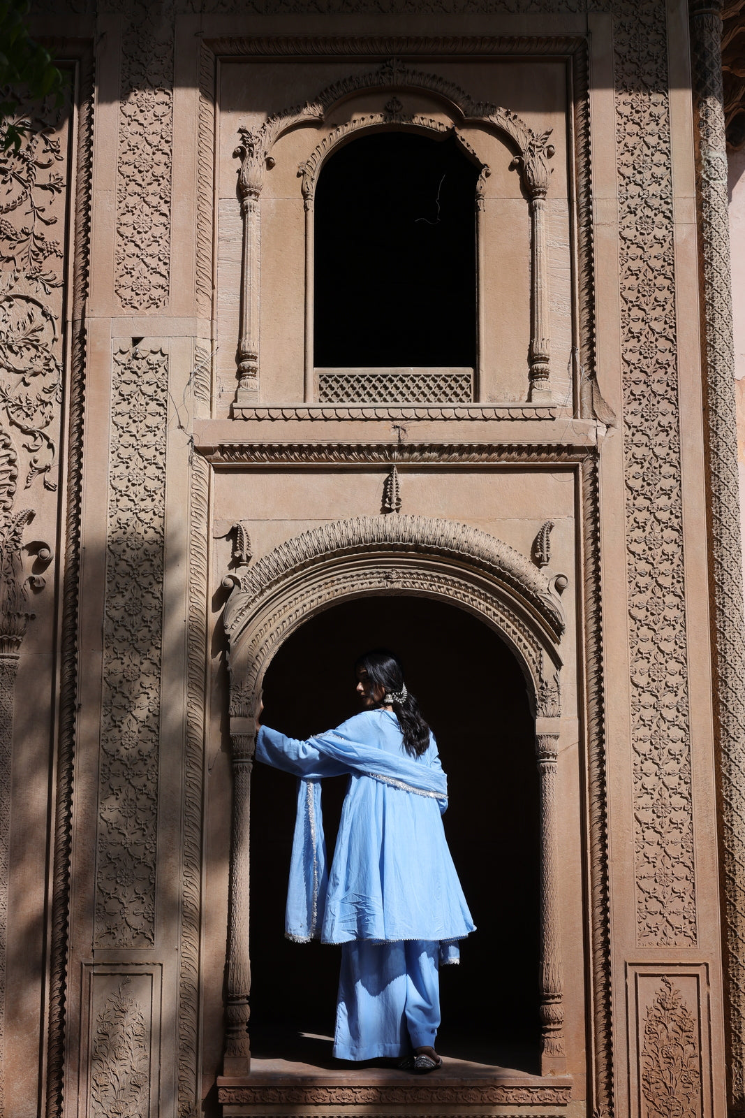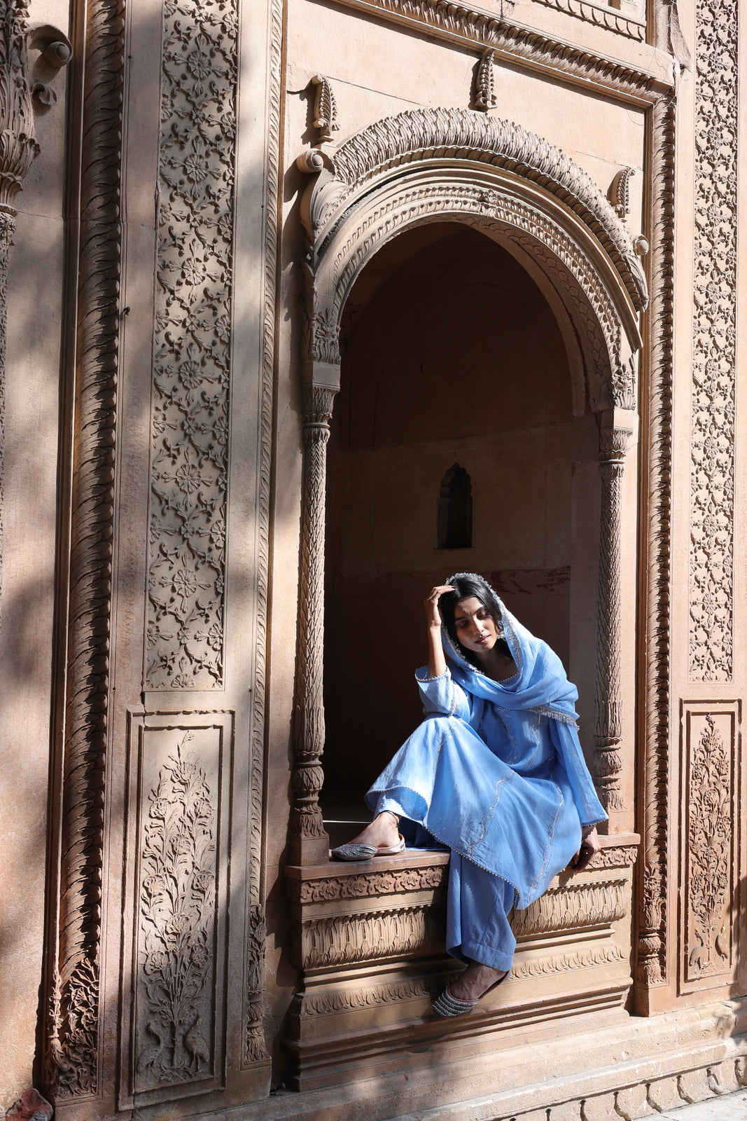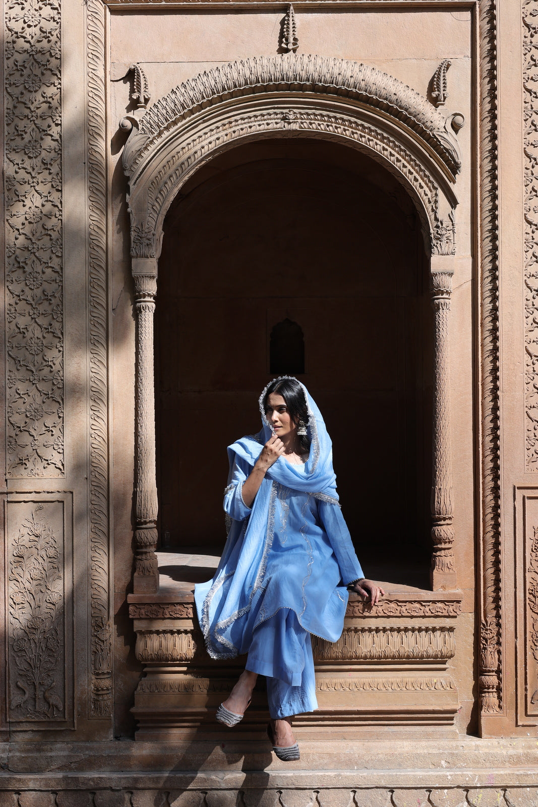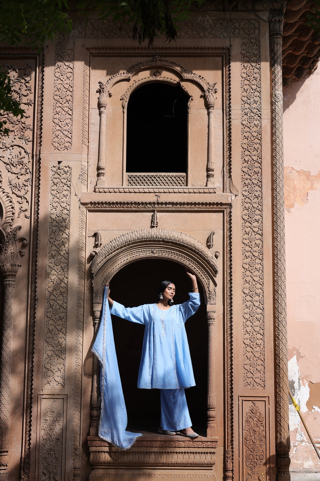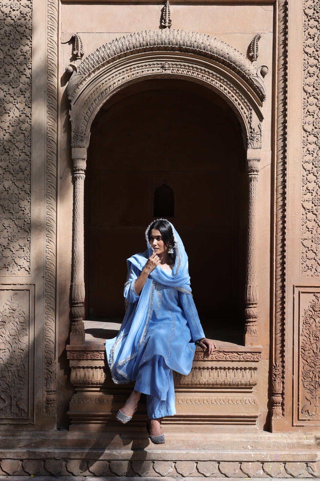 The Zehra set is for women who want festive without the fuss. This powder blue mul chanderi ensemble features a short kalidar kurta that flares gently from the waist, paired with wide-leg palazzo pants instead of traditional salwar. The result? Movement, ease, and a silhouette that feels distinctly modern.
