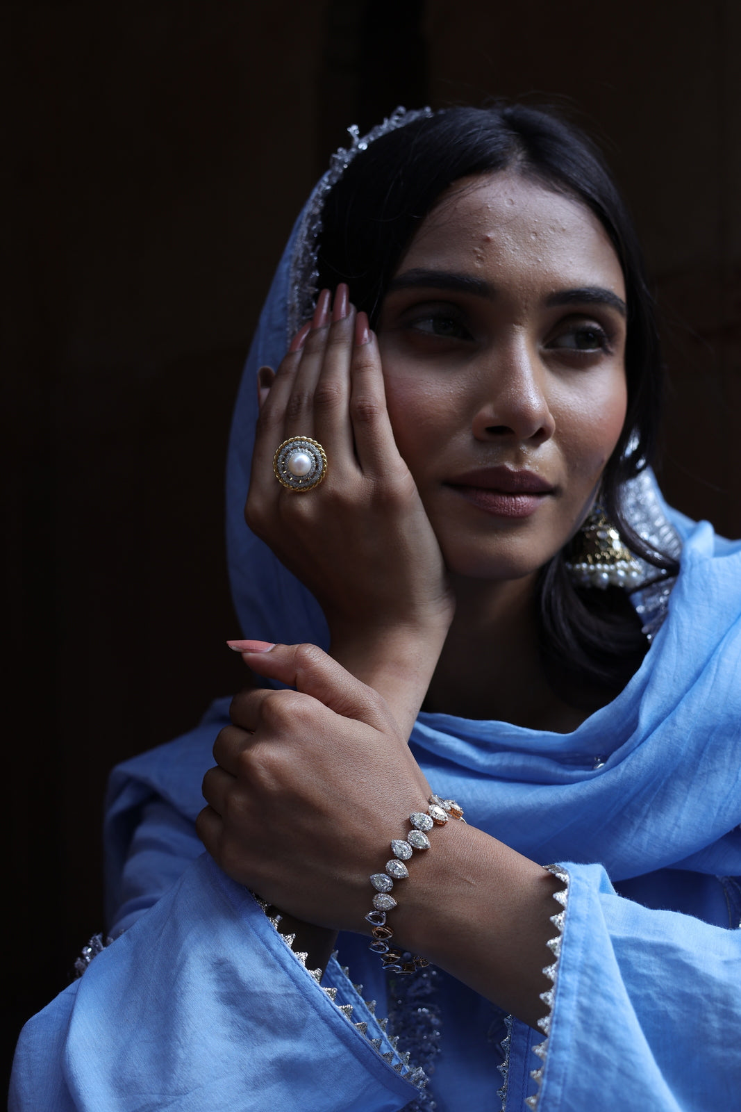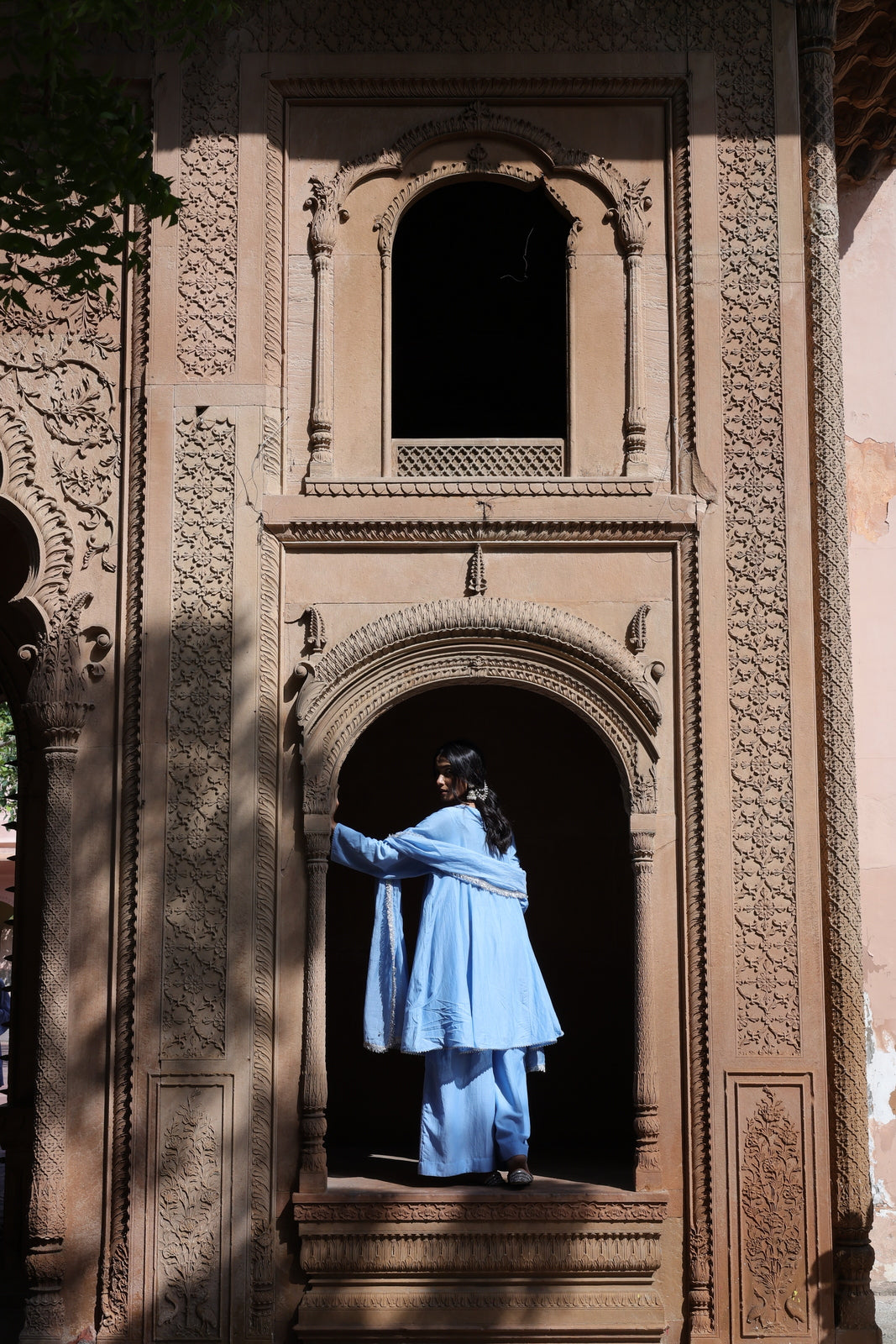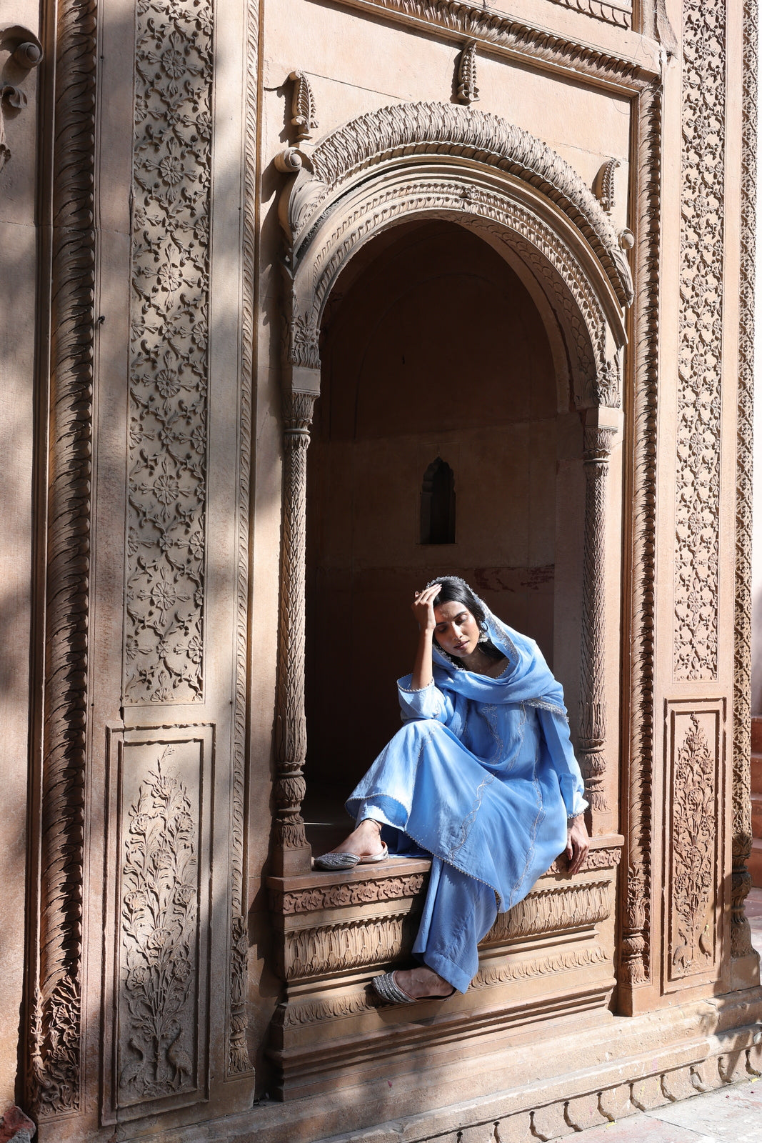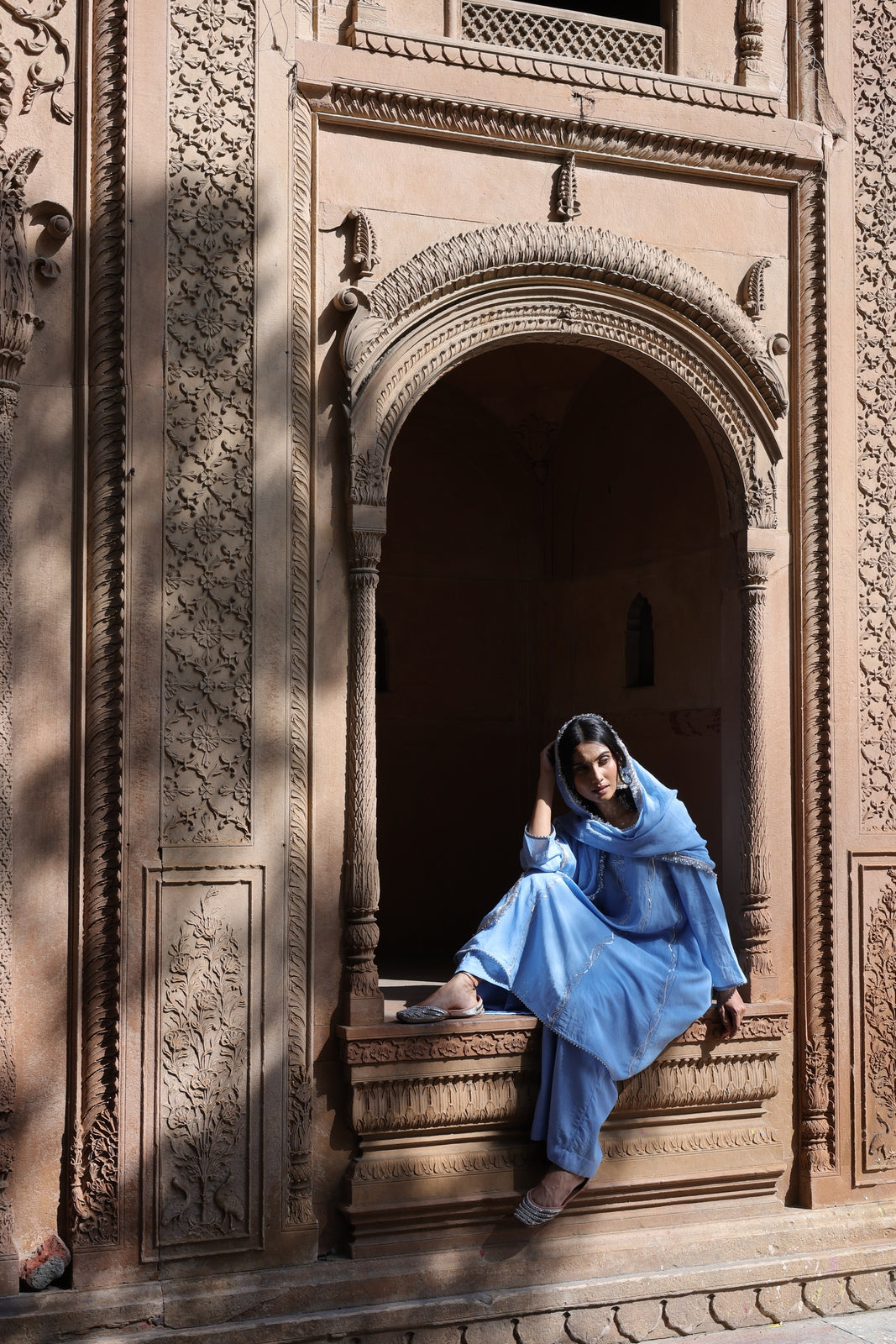 The Zehra set is for women who want festive without the fuss. This powder blue mul chanderi ensemble features a short kalidar kurta that flares gently from the waist, paired with wide-leg palazzo pants instead of traditional salwar. The result? Movement, ease, and a silhouette that feels distinctly modern.