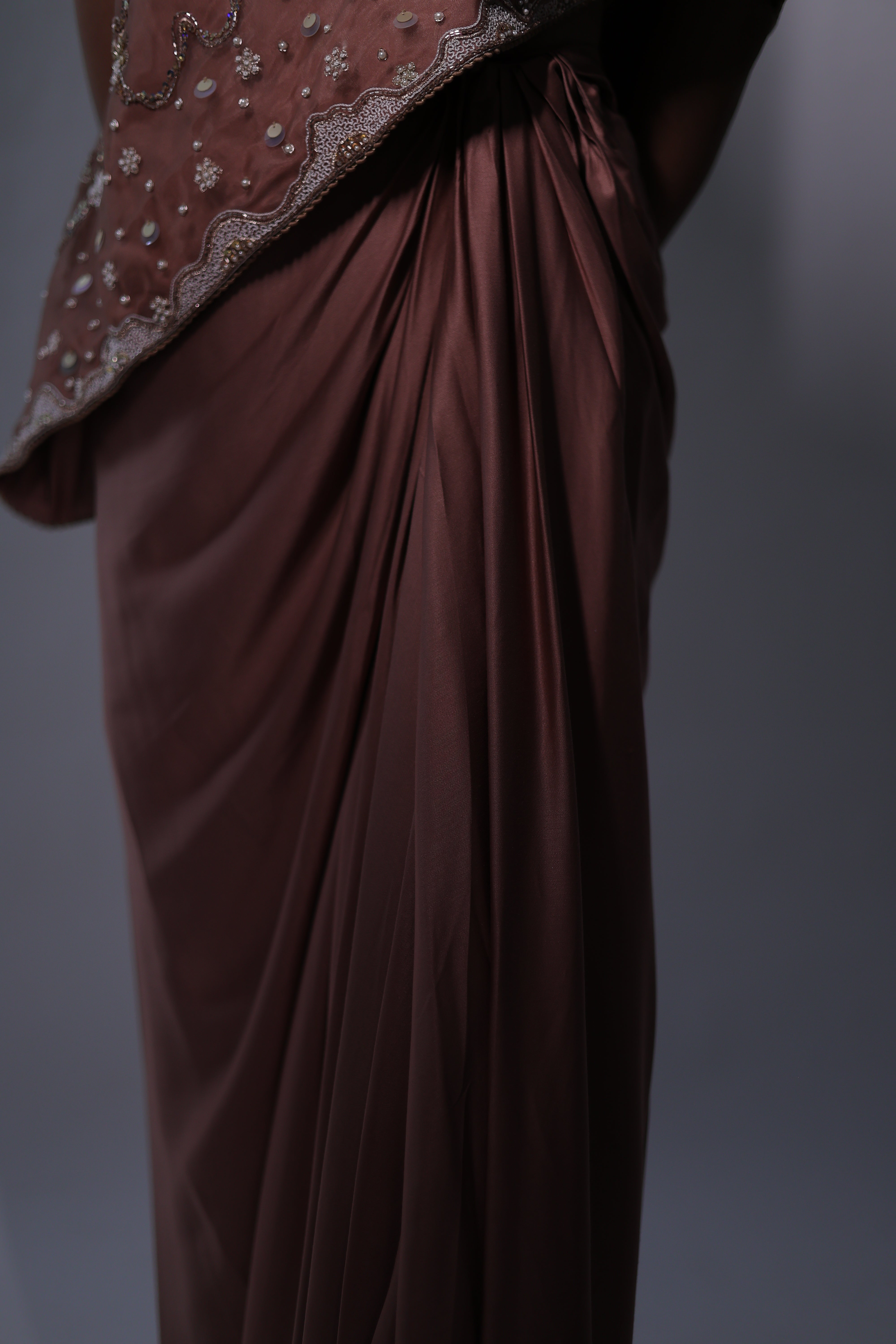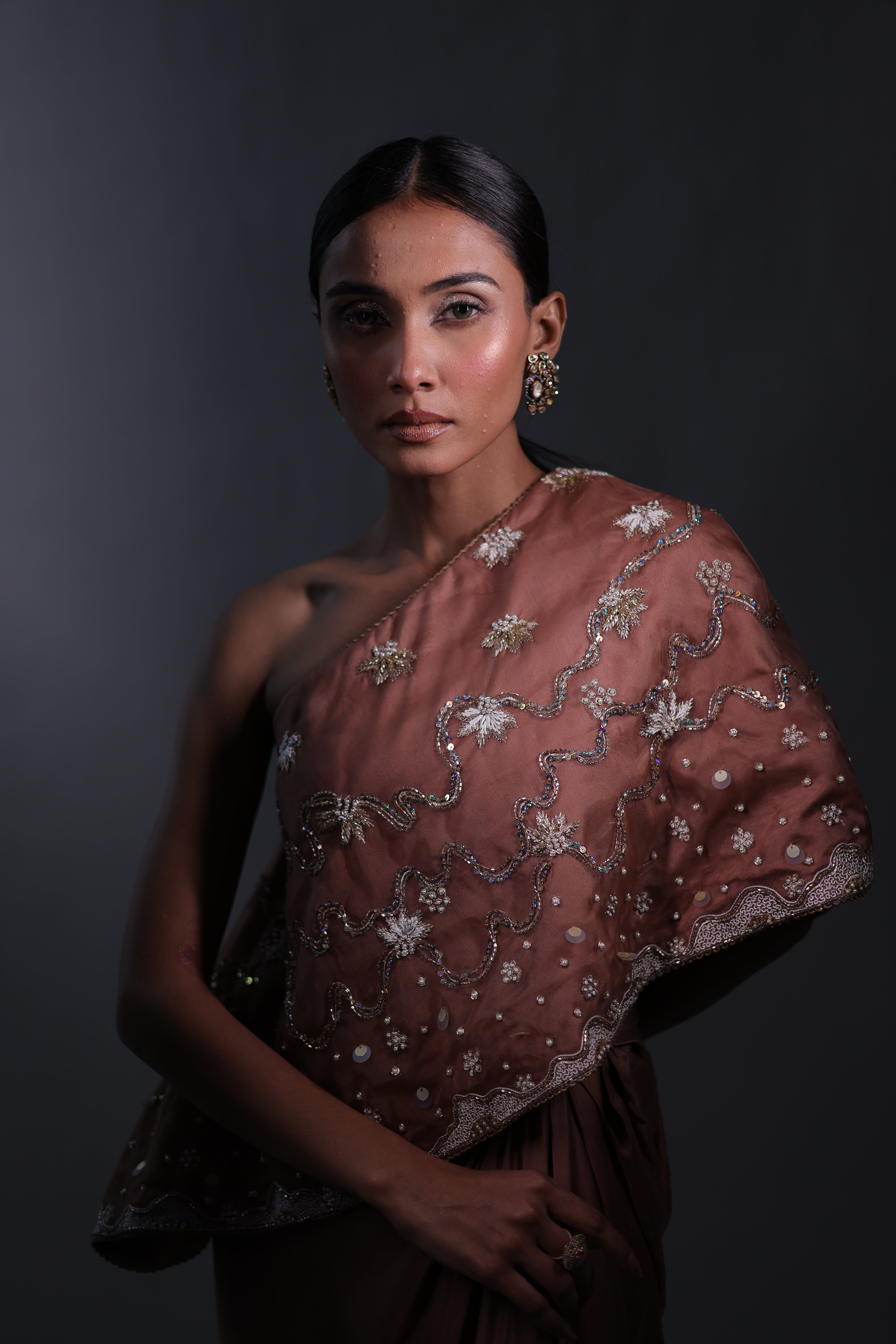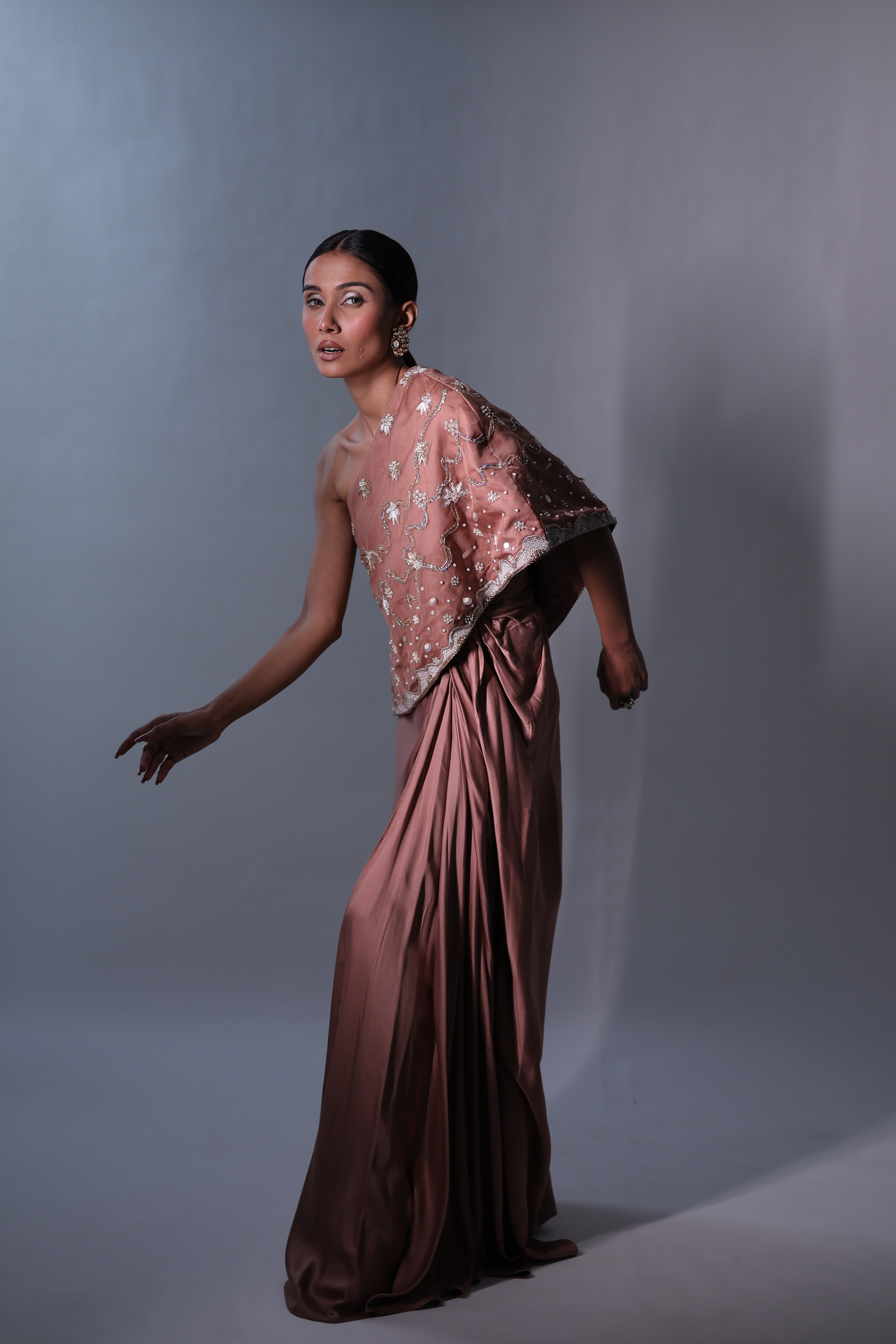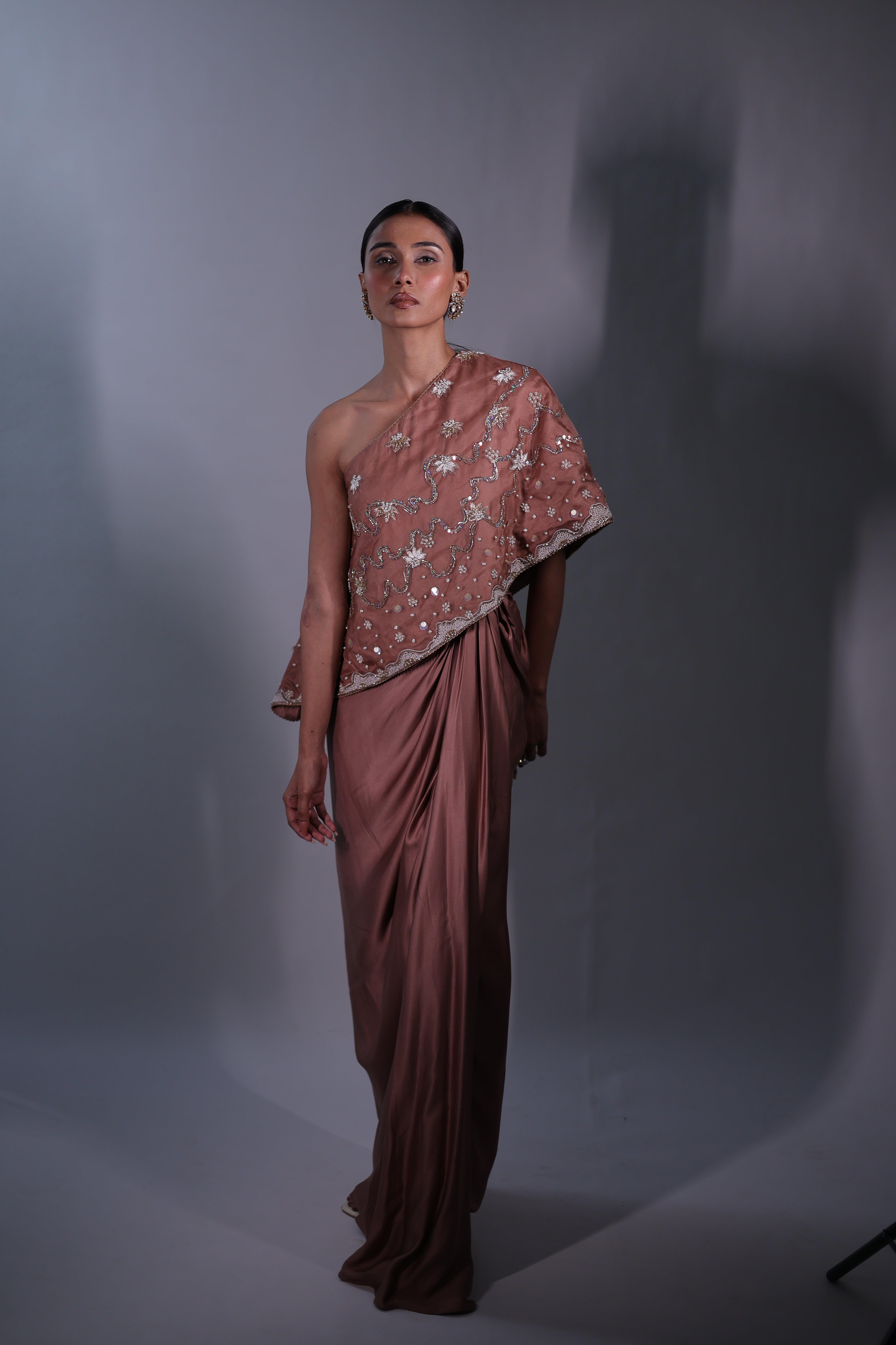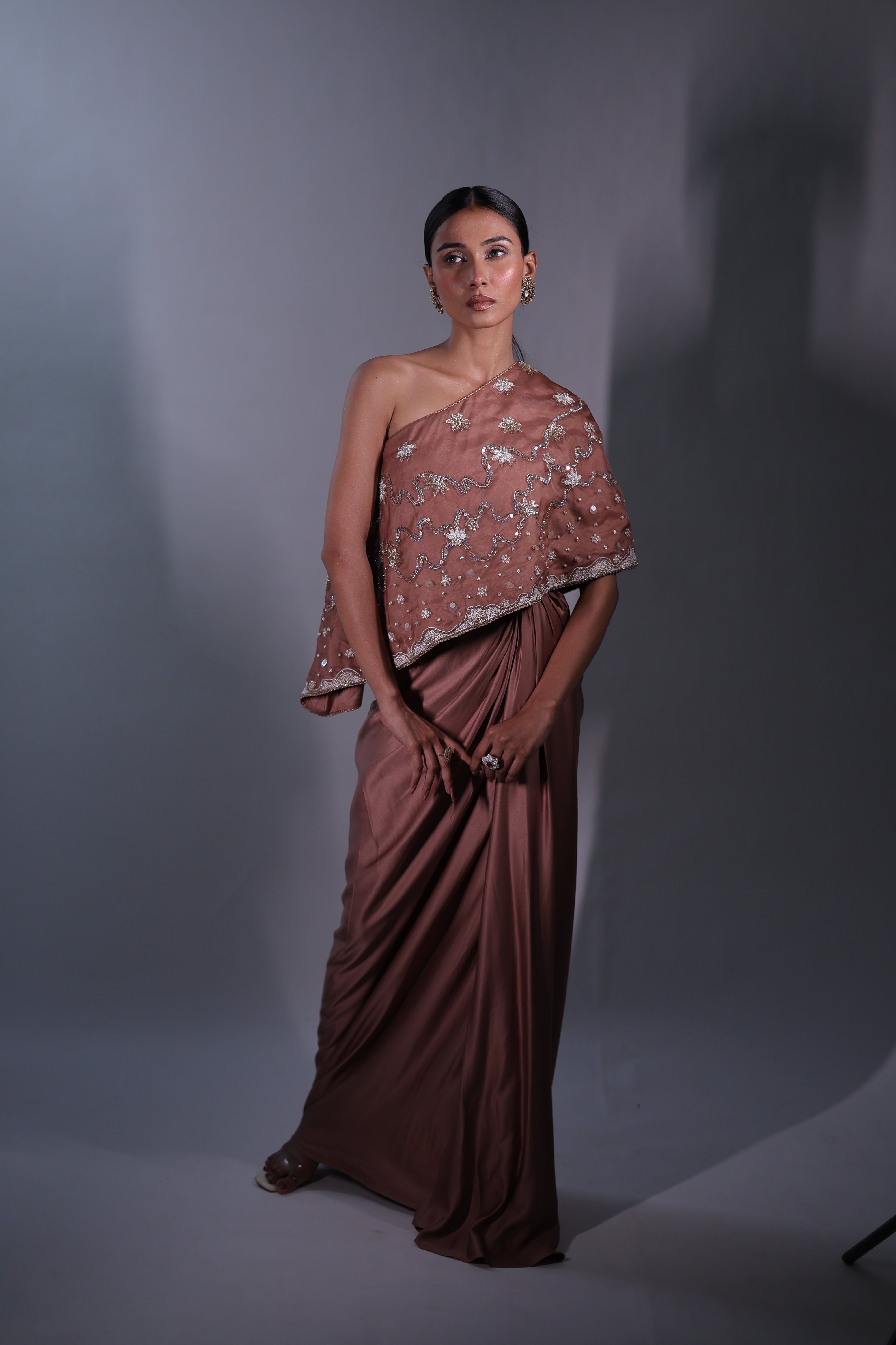 A sophisticated Rosy brown three-piece ensemble featuring a one-shoulder cape with hand embroidery details & a bustier. The bustier and cape are adorned with intricate floral embroidery, beaded with delicate sequins for a subtle shimmer. The matching draped skirt flows gracefully, creating a seamless and elegant silhouette that moves beautifully with the body.
