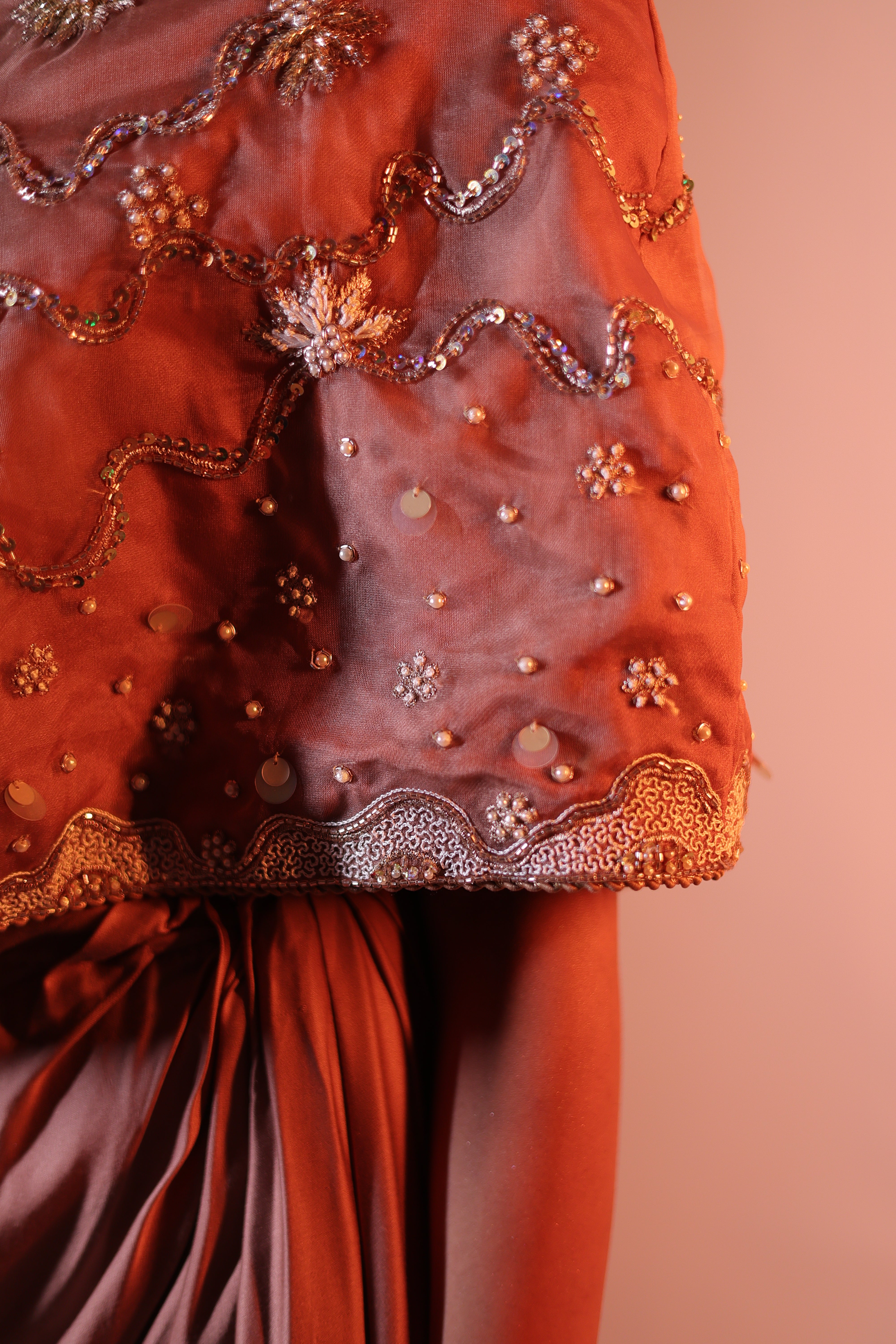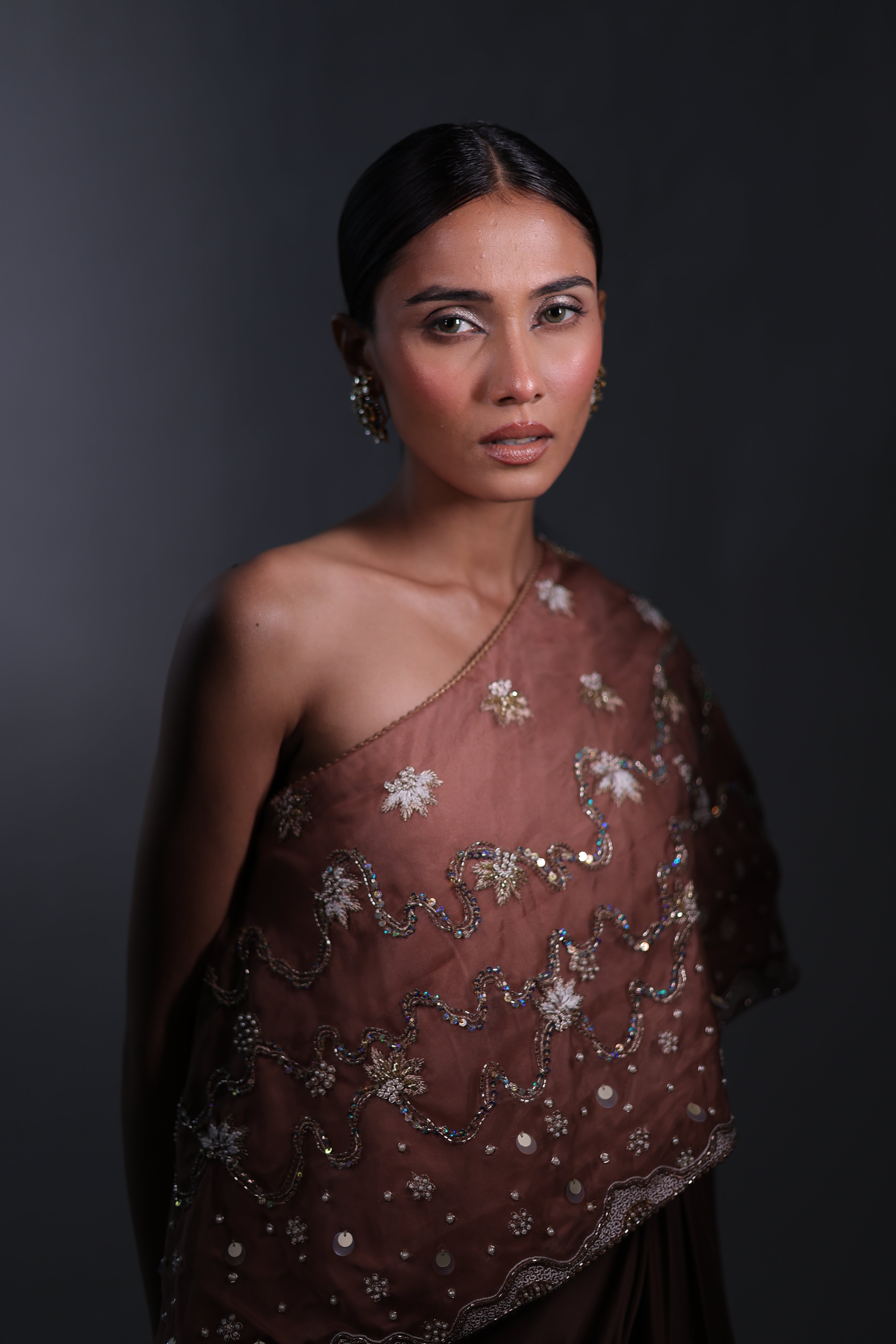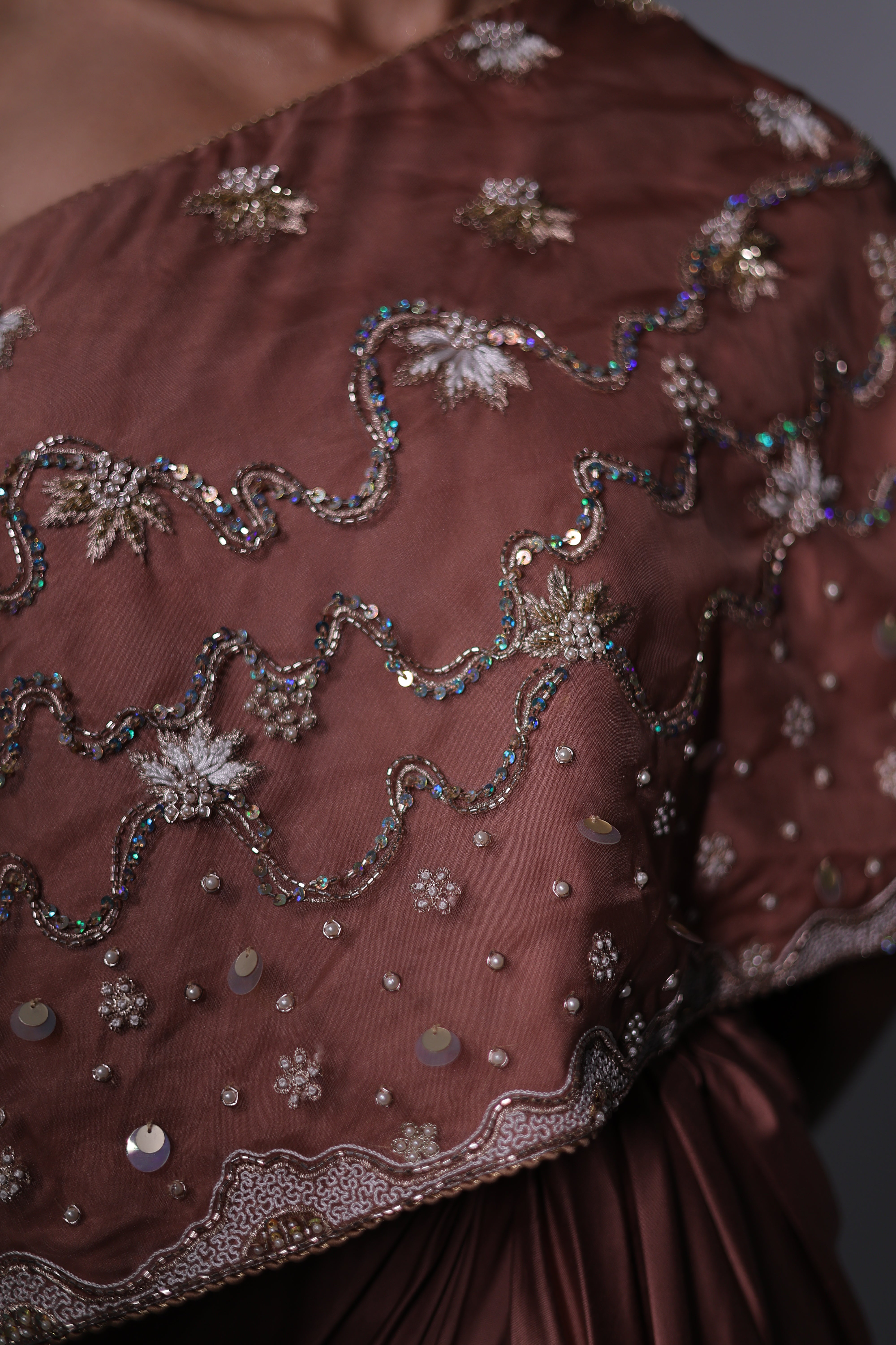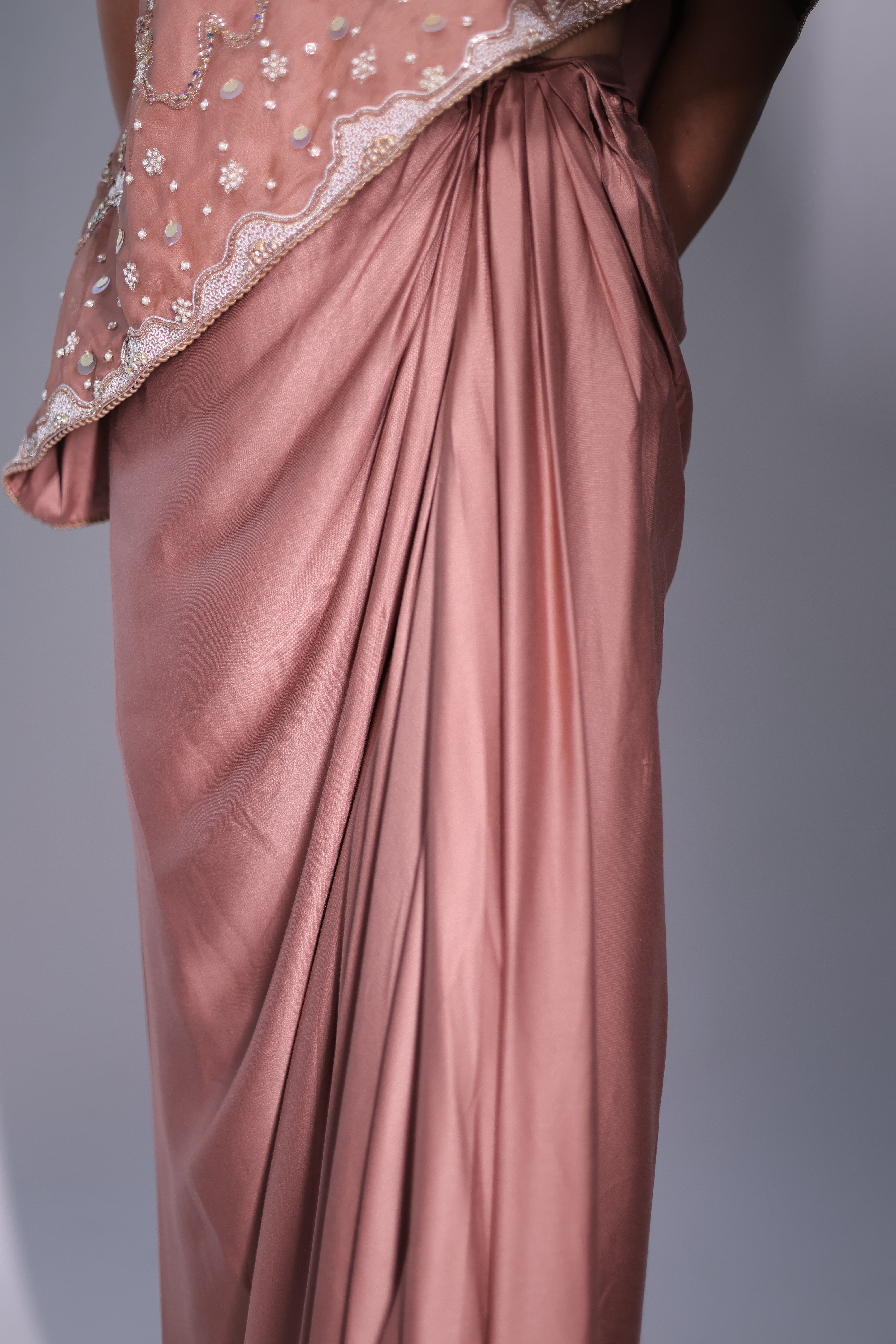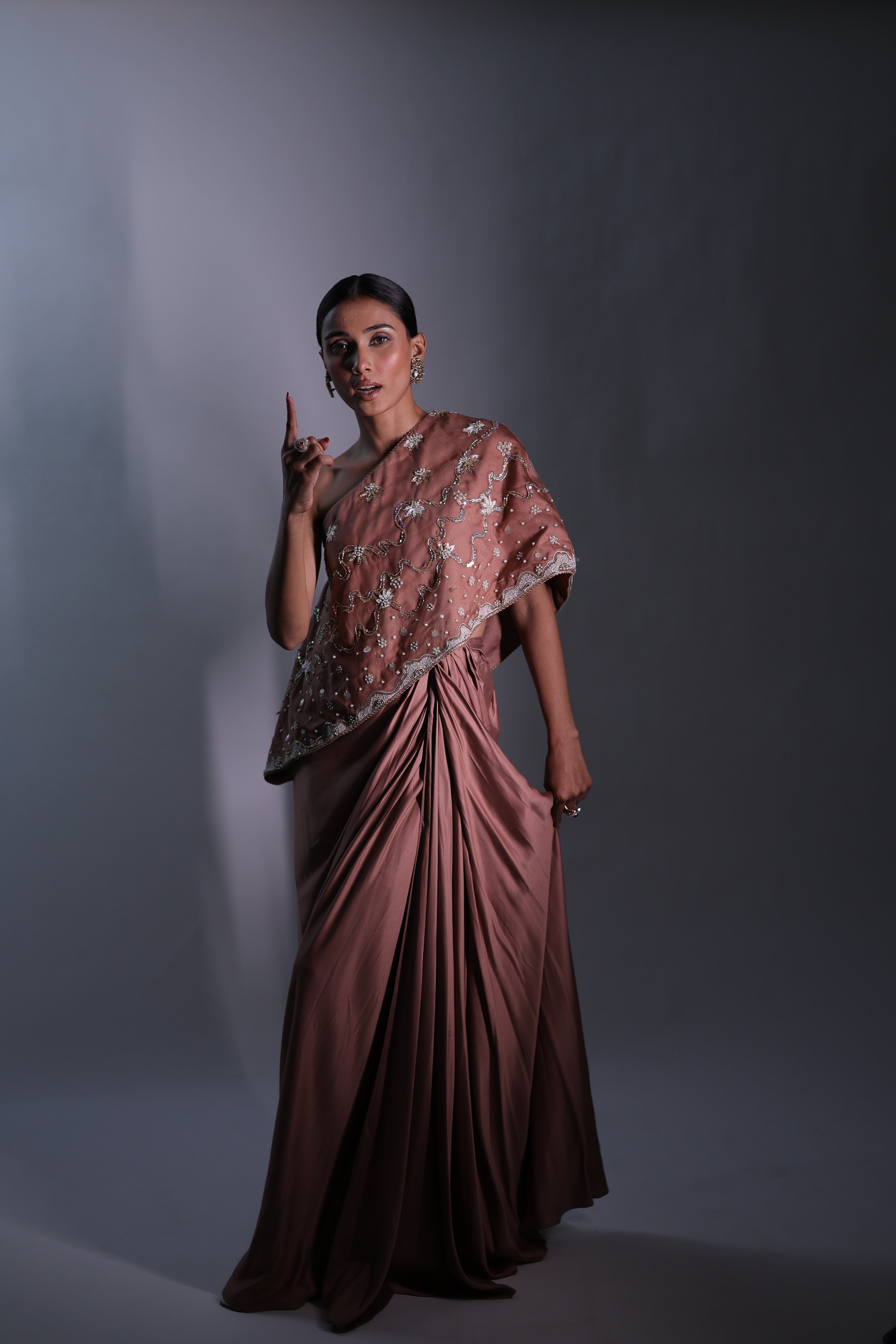 A sophisticated Rosy brown three-piece ensemble featuring a one-shoulder cape with hand embroidery details & a bustier. The bustier and cape are adorned with intricate floral embroidery, beaded with delicate sequins for a subtle shimmer. The matching draped skirt flows gracefully, creating a seamless and elegant silhouette that moves beautifully with the body.
